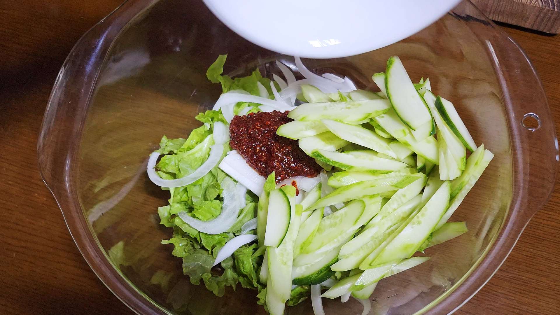 볼에 상추, 양파, 오이, 양념장을 넣고 무쳐줍니다.