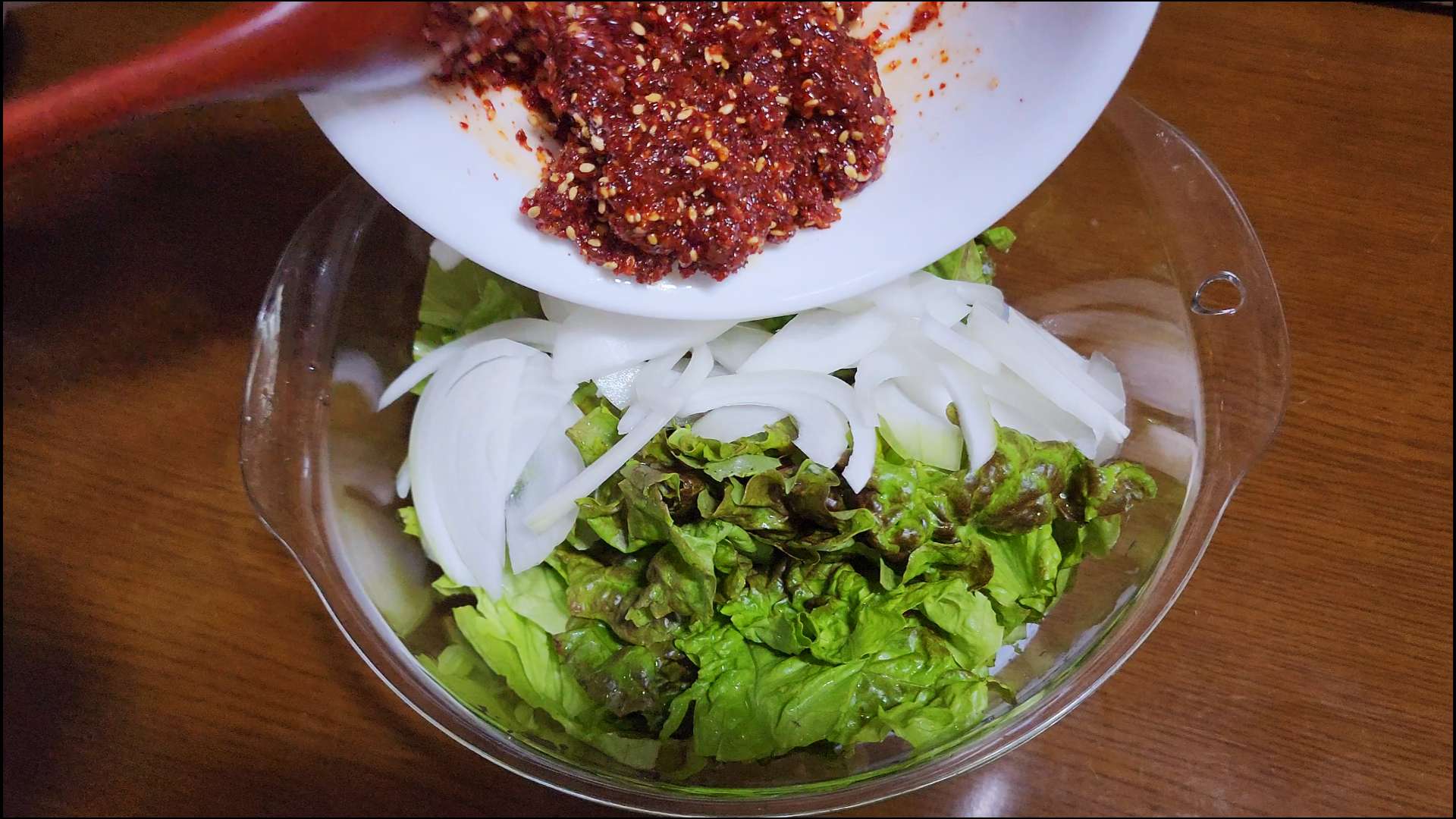 아삭한 상추와 양파를 매콤달콤 짭조름한 양념에
