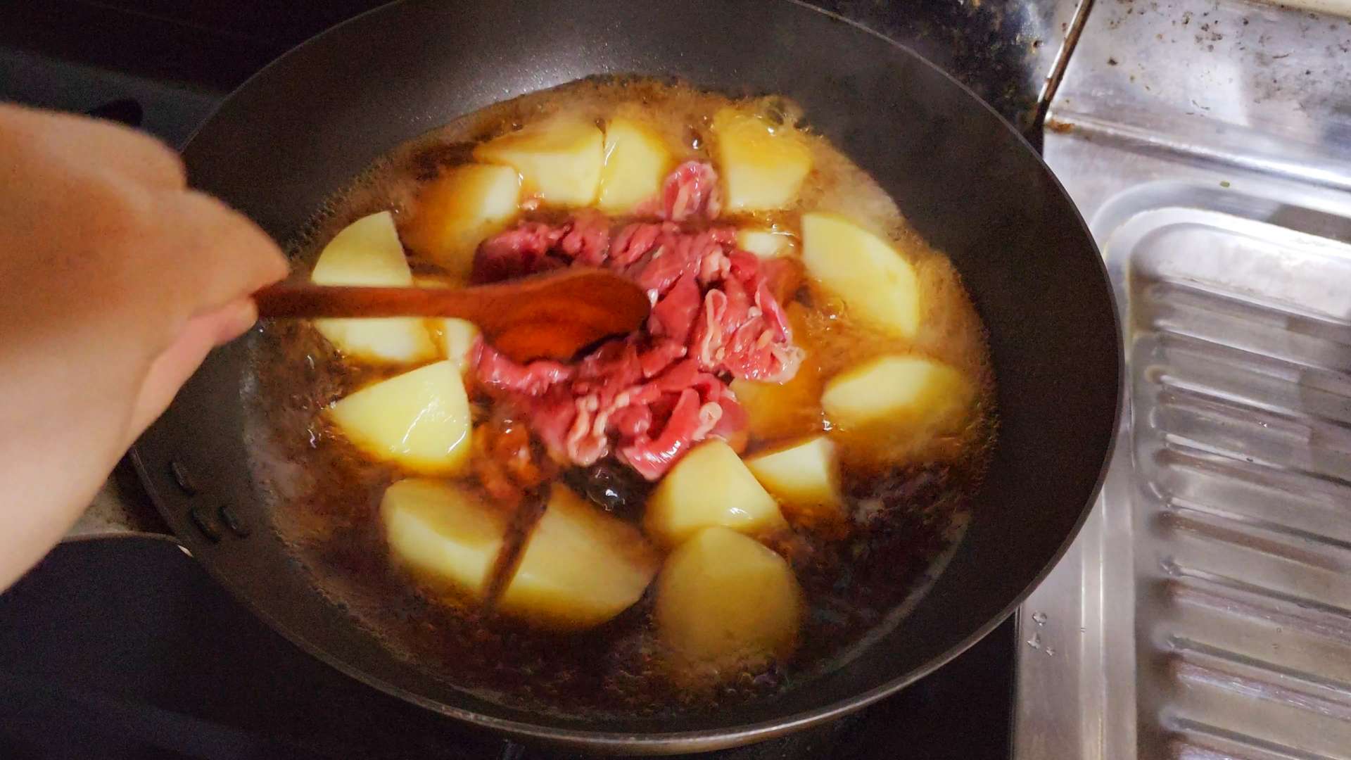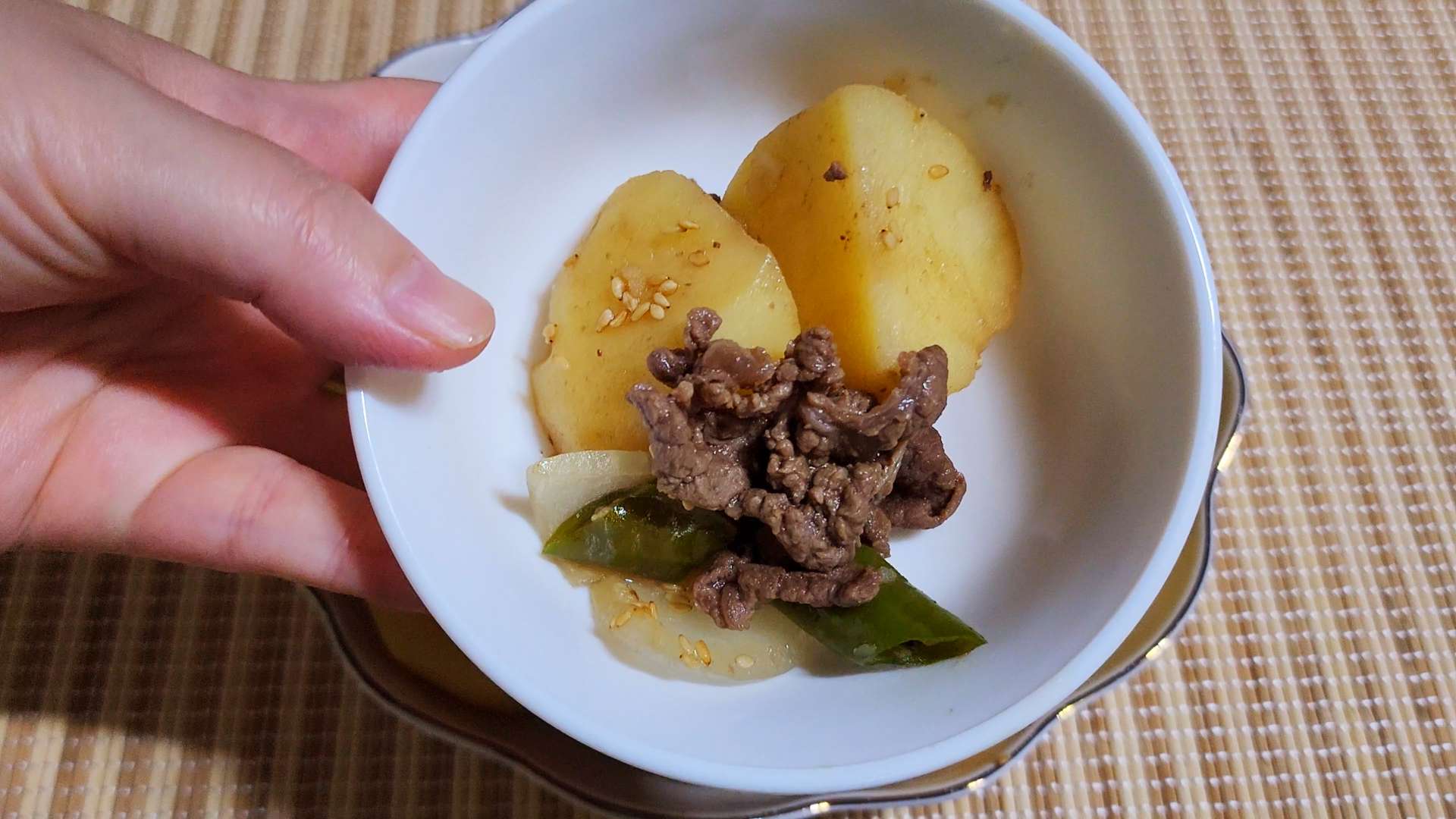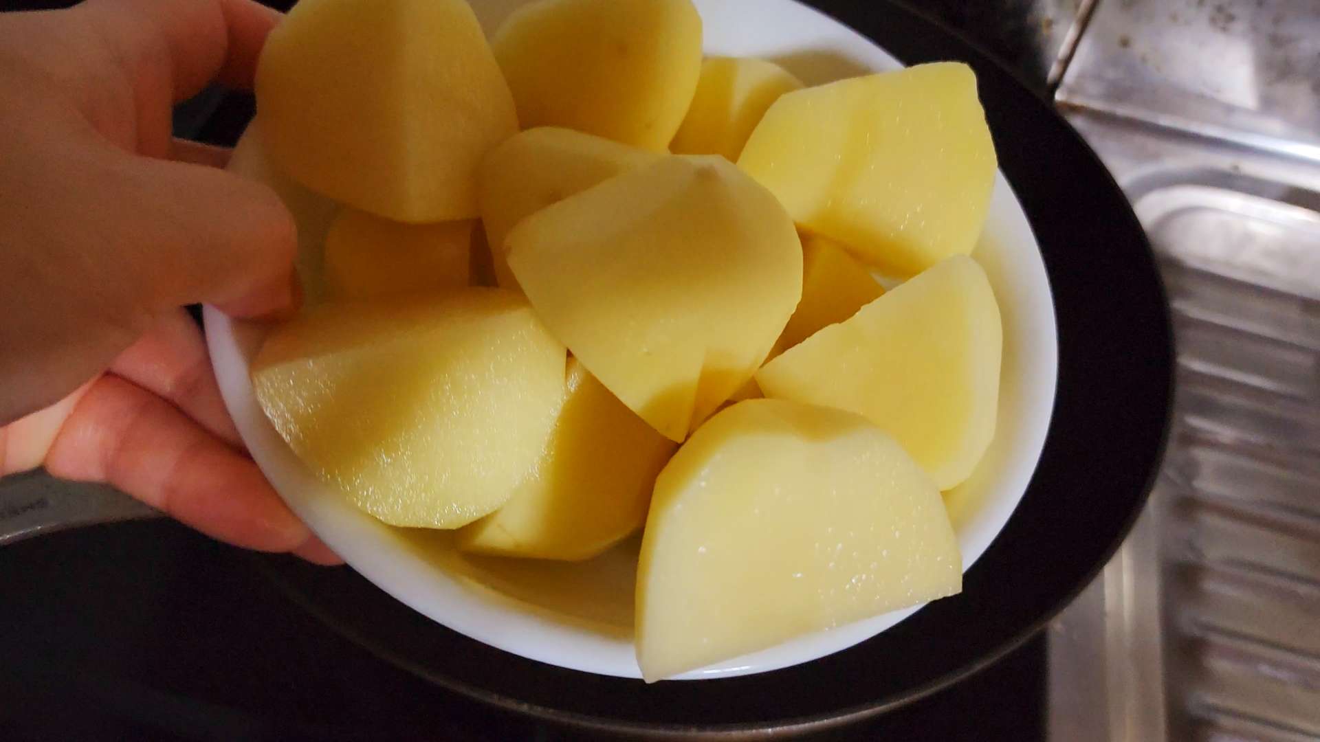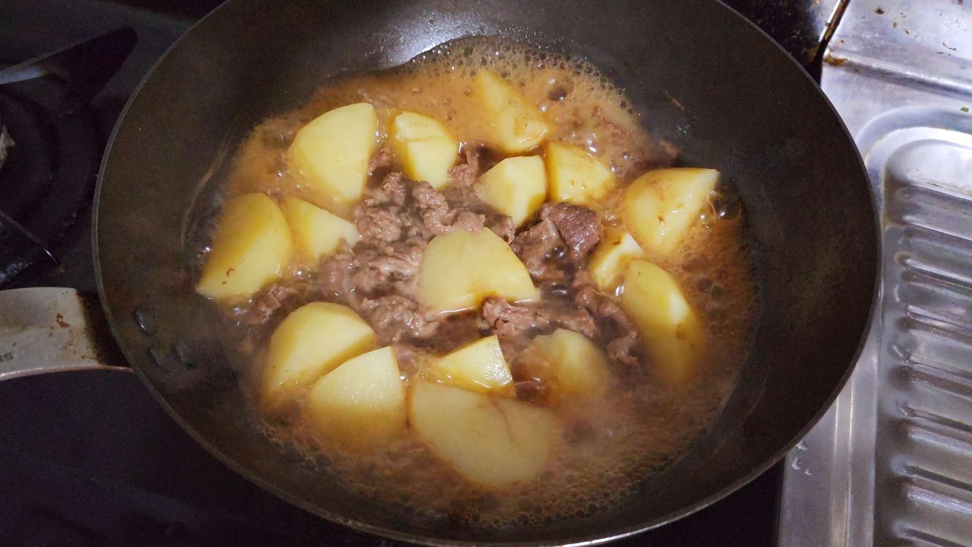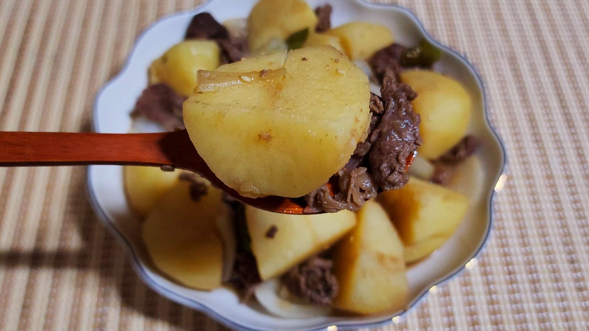잘 익은 감자와 소고기를 짭조름한 양념과 같이 먹으면 맛있답니다.