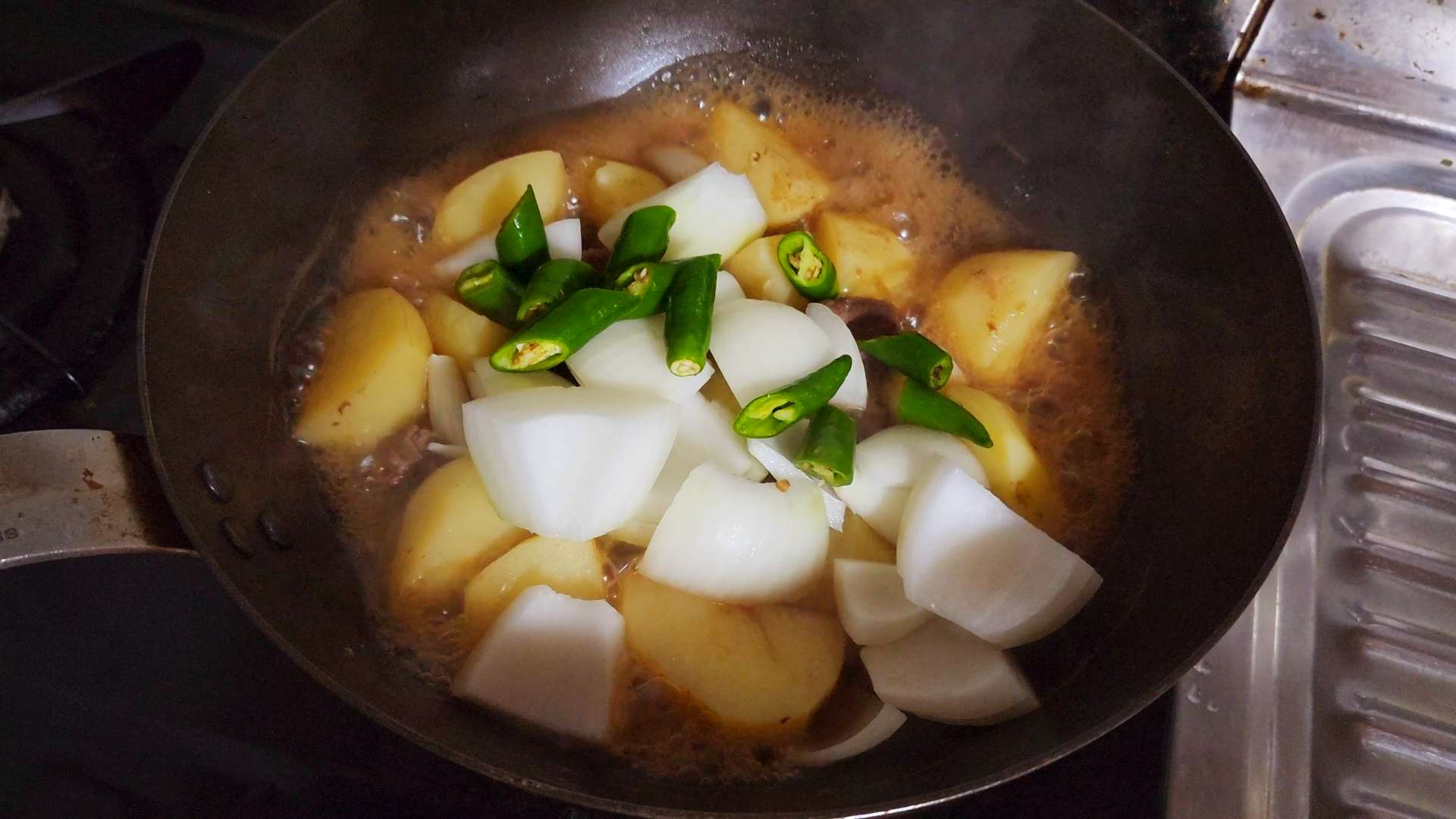 재료: 감자 4개, 소고기 불고기용 200g, 양파 1개, 청양고추 2개, 통깨