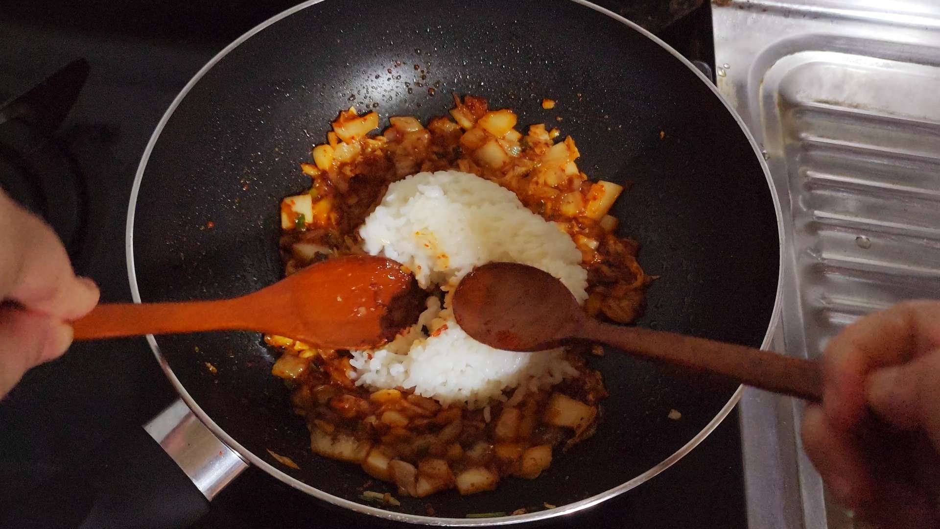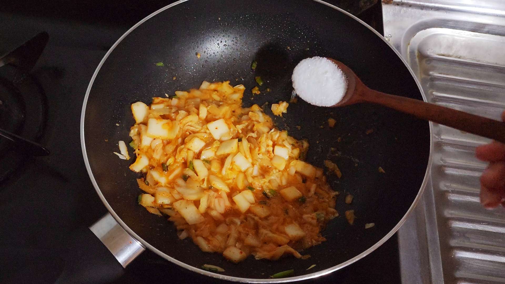 자른 김치, 김치 국물 2T 넣고 볶아줍니다.