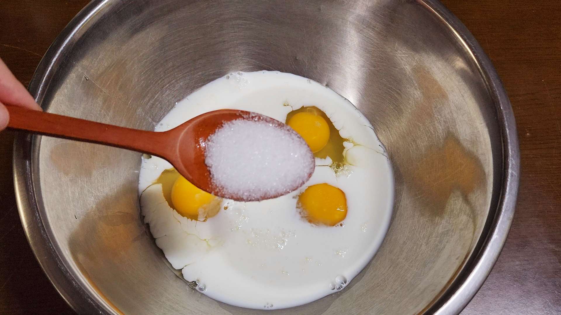달걀 4개, 우유 100ml, 소금 한 꼬집, 설탕 1T, 후추를 넣고 섞어줍니다.