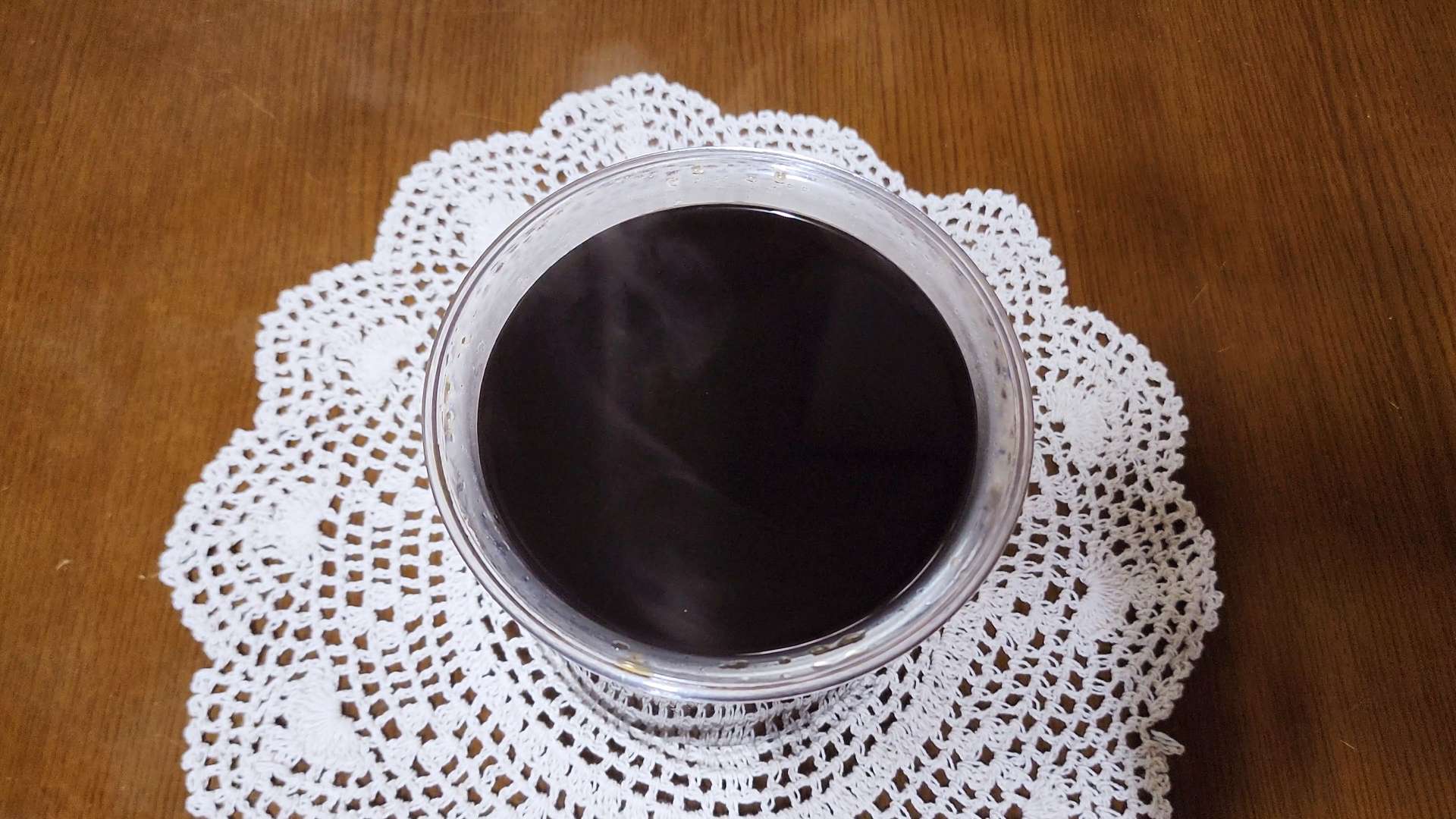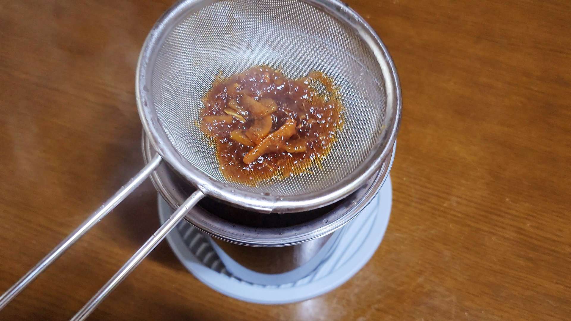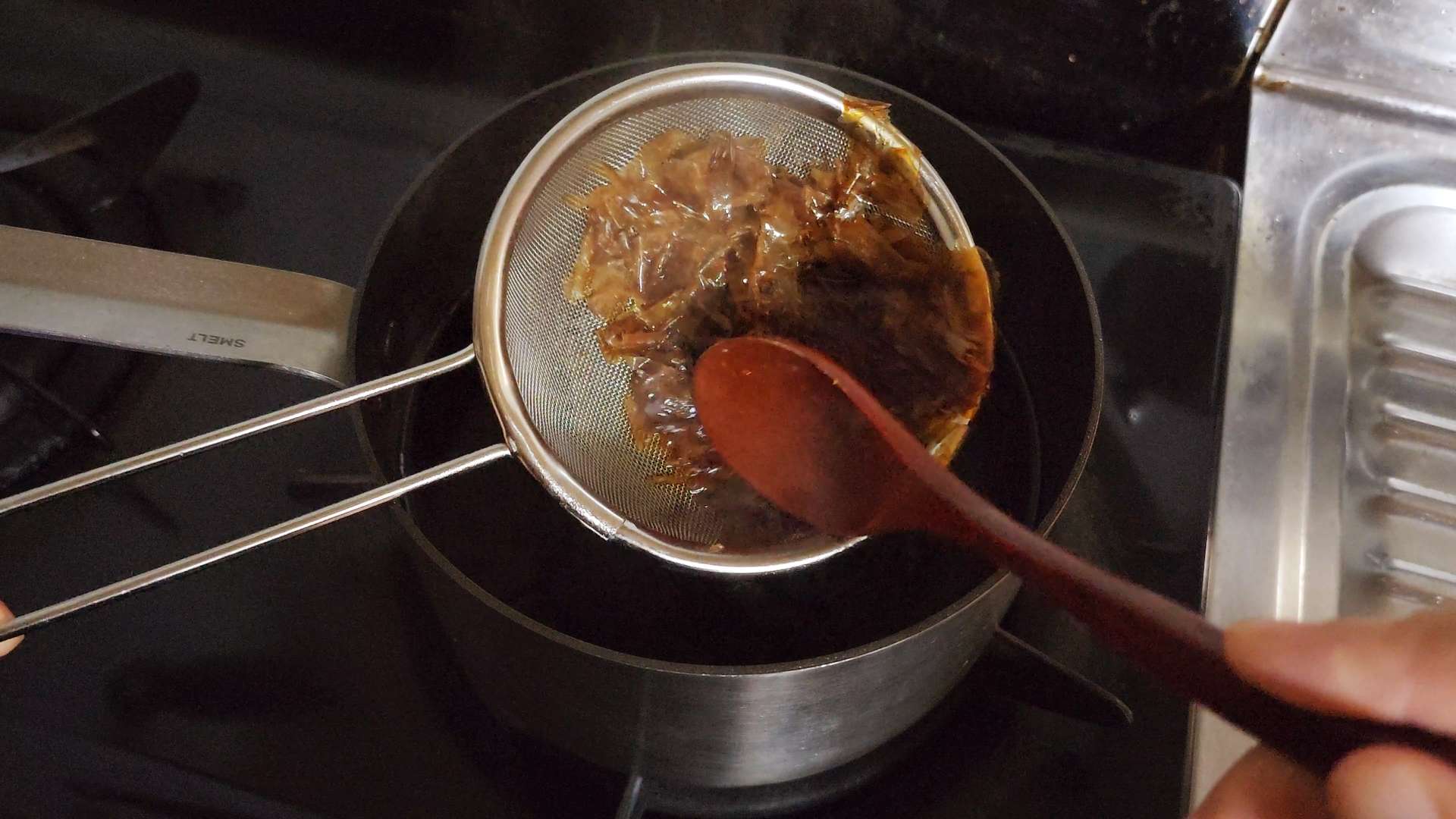 불을 끈 뒤 가쓰오부시 한 줌을 체에 넣고 2분 정도