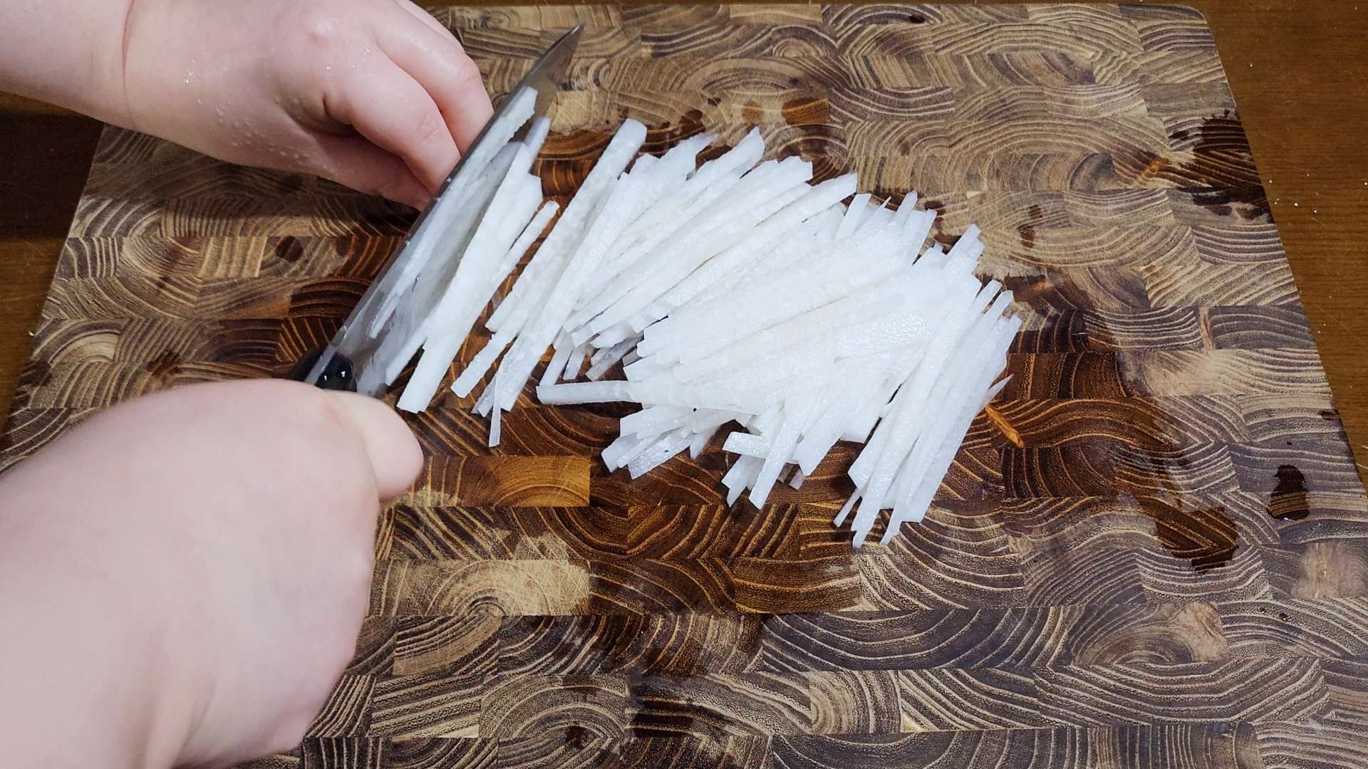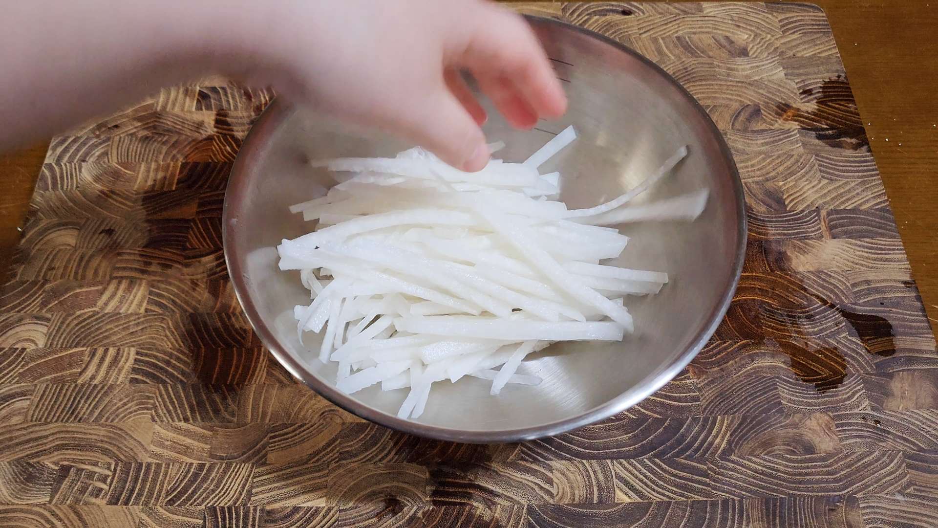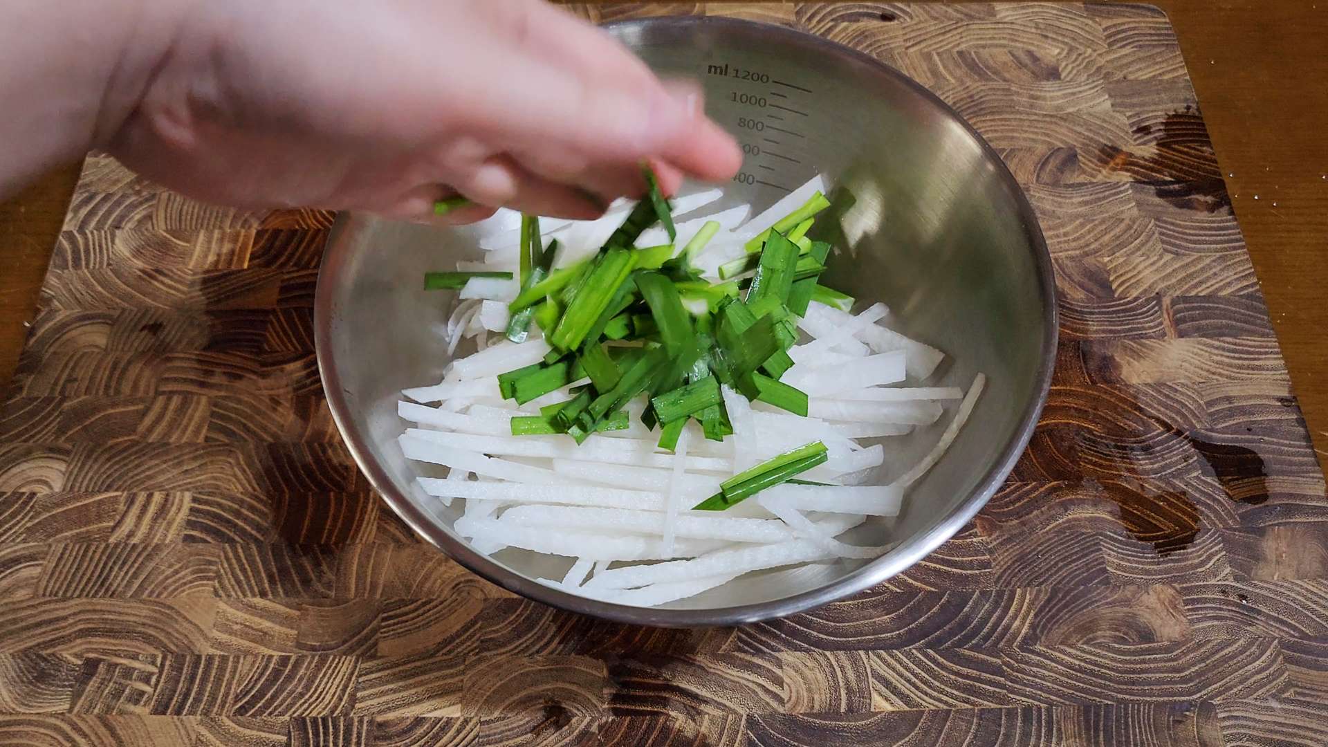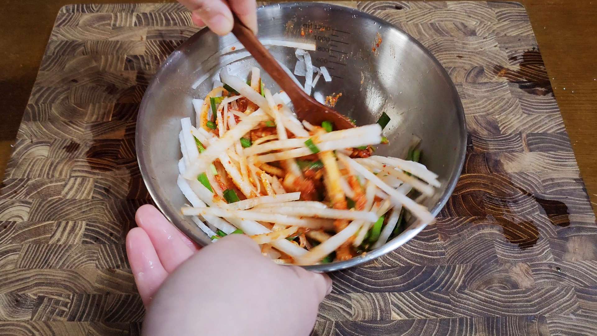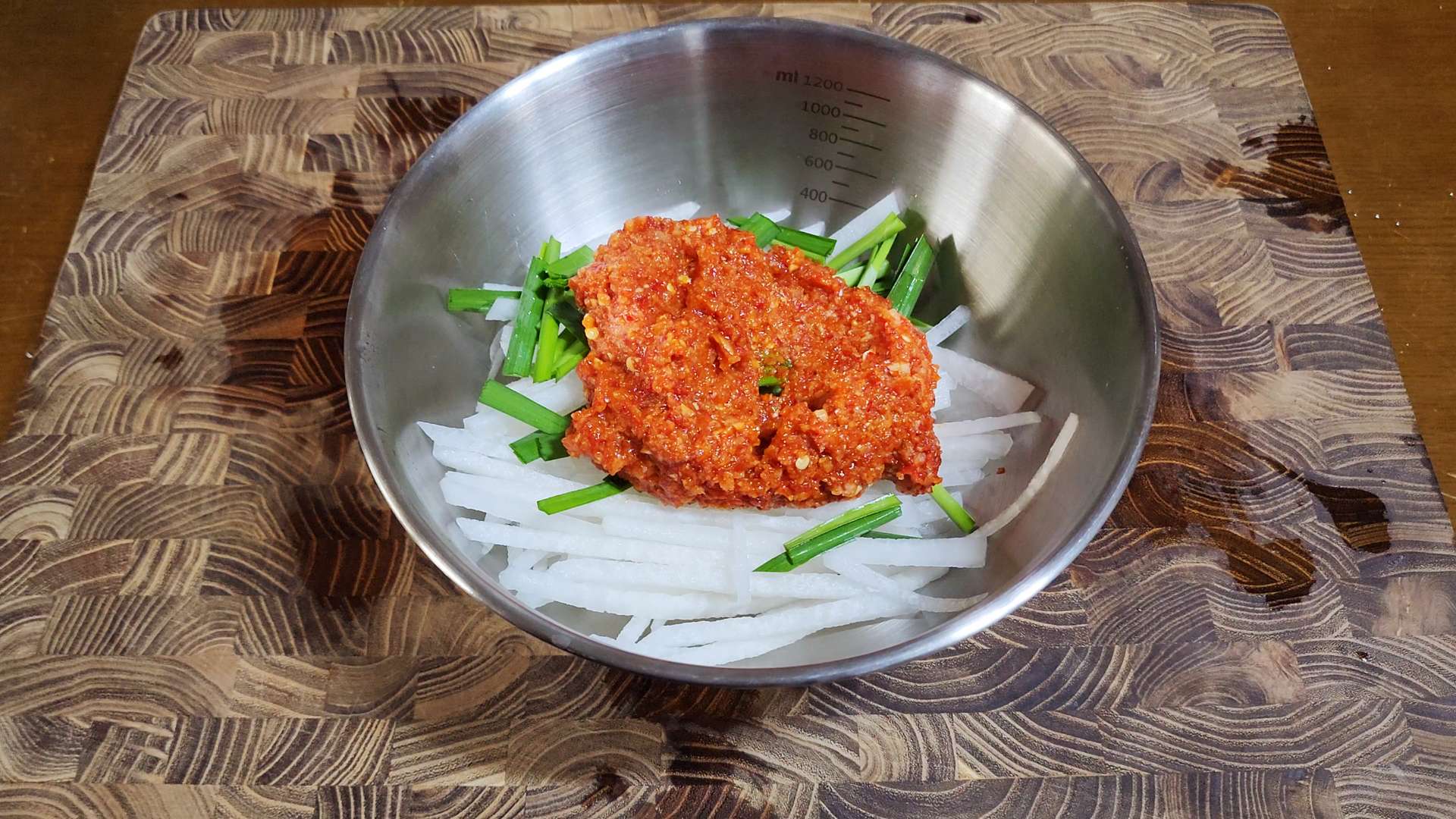 무, 부추, 양념을 넣고 버무려 줍니다.