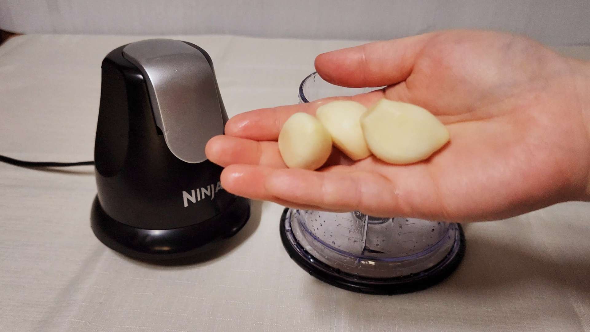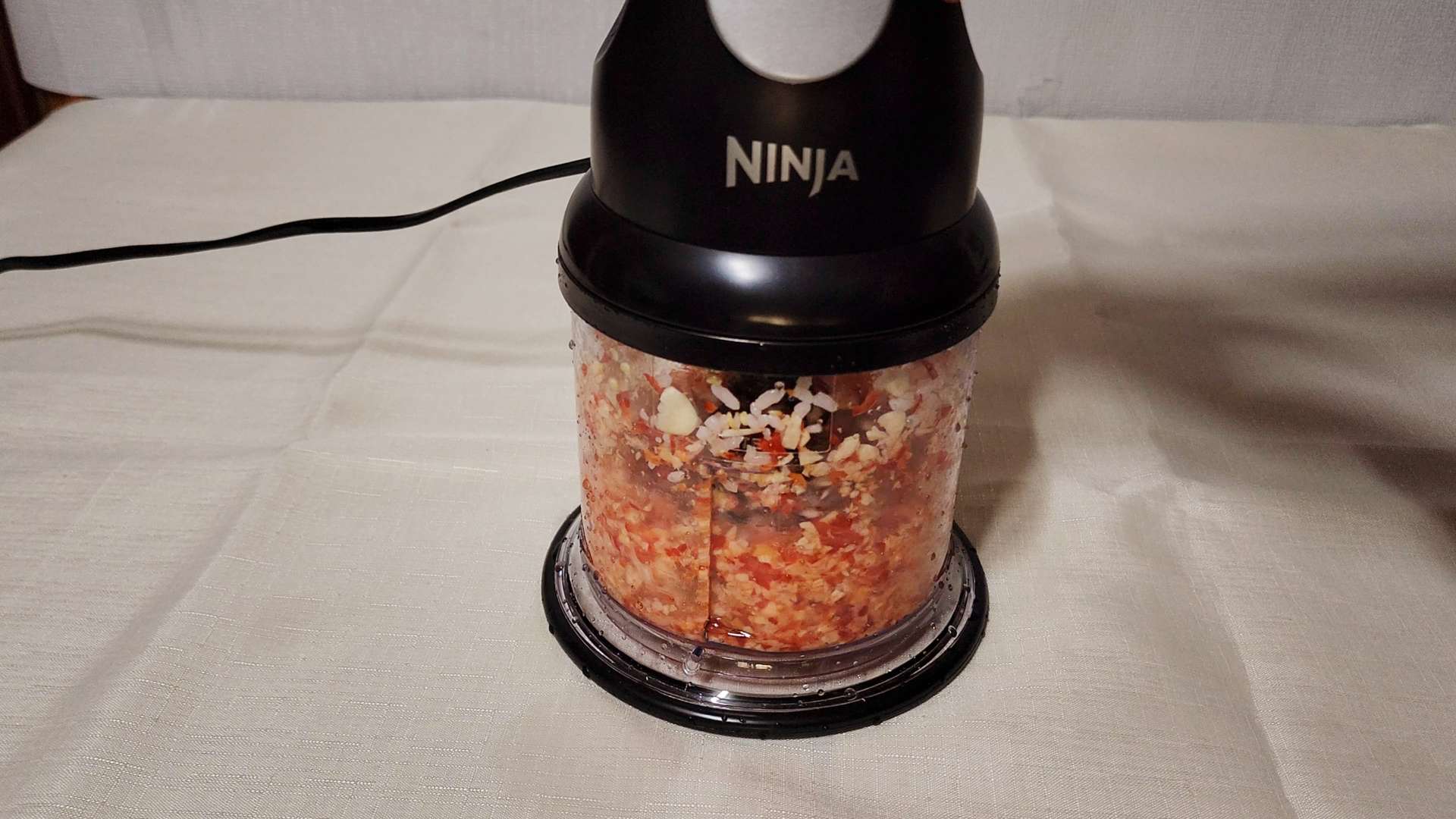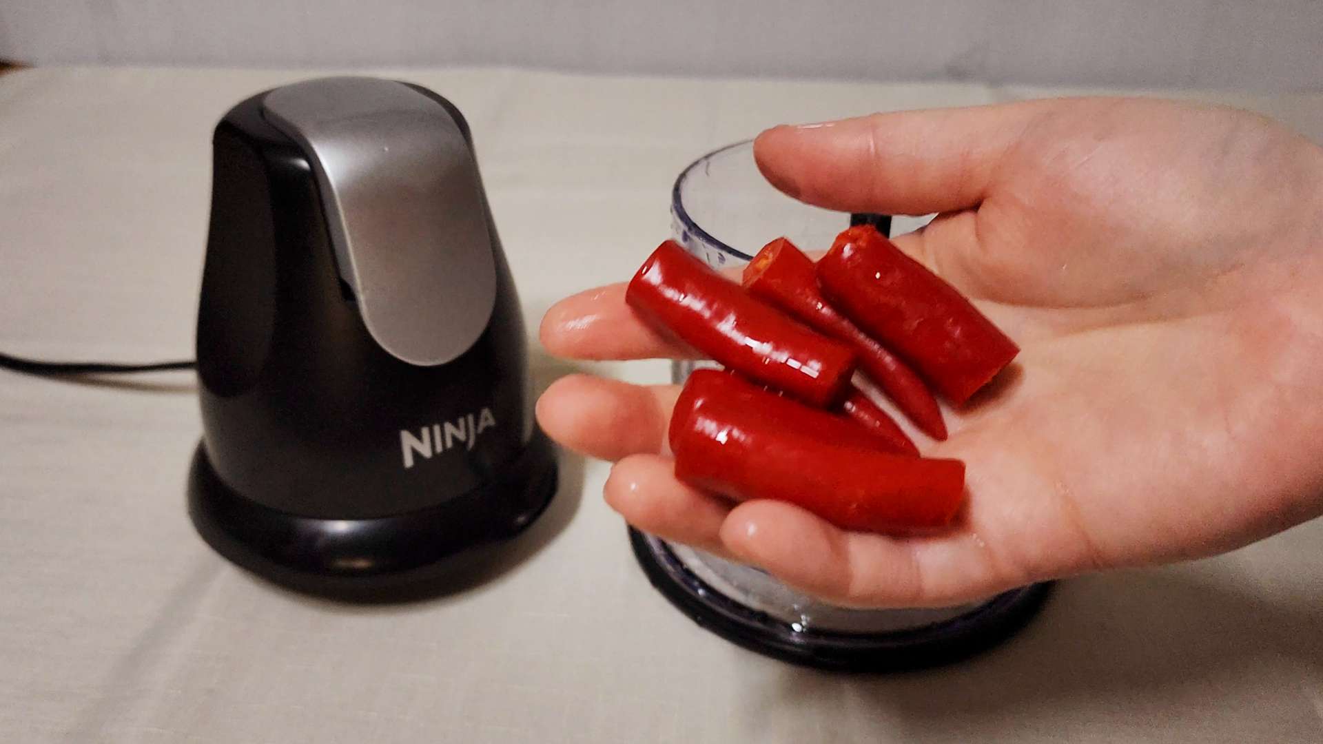 믹서기에 마늘 3알, 생강 한톨, 홍고추 3개, 찬밥 조금 넣고 갈아줍니다.