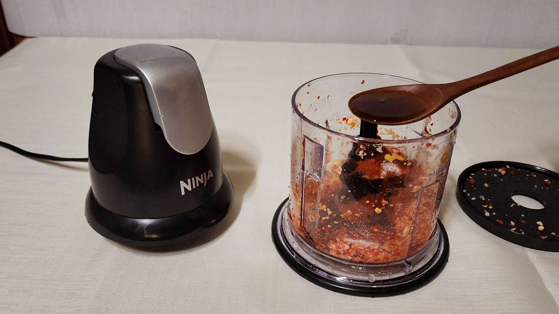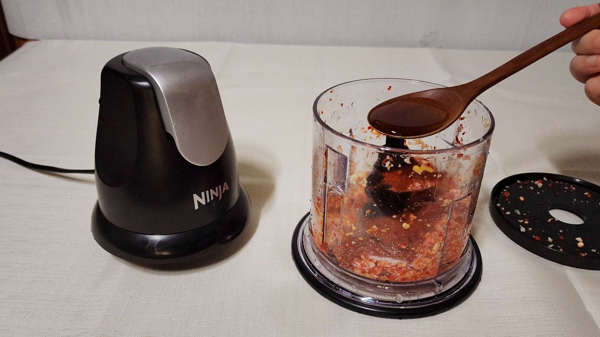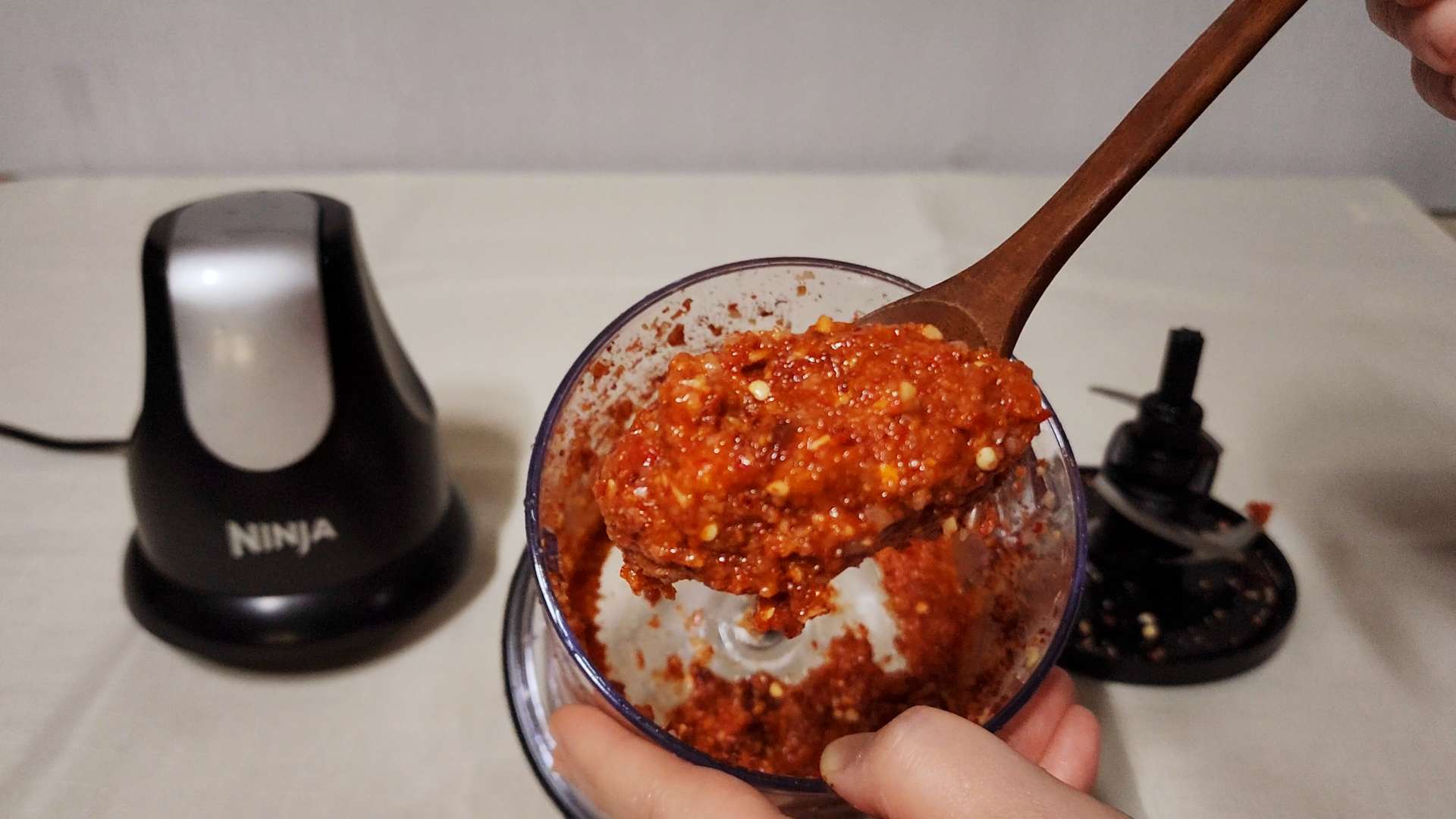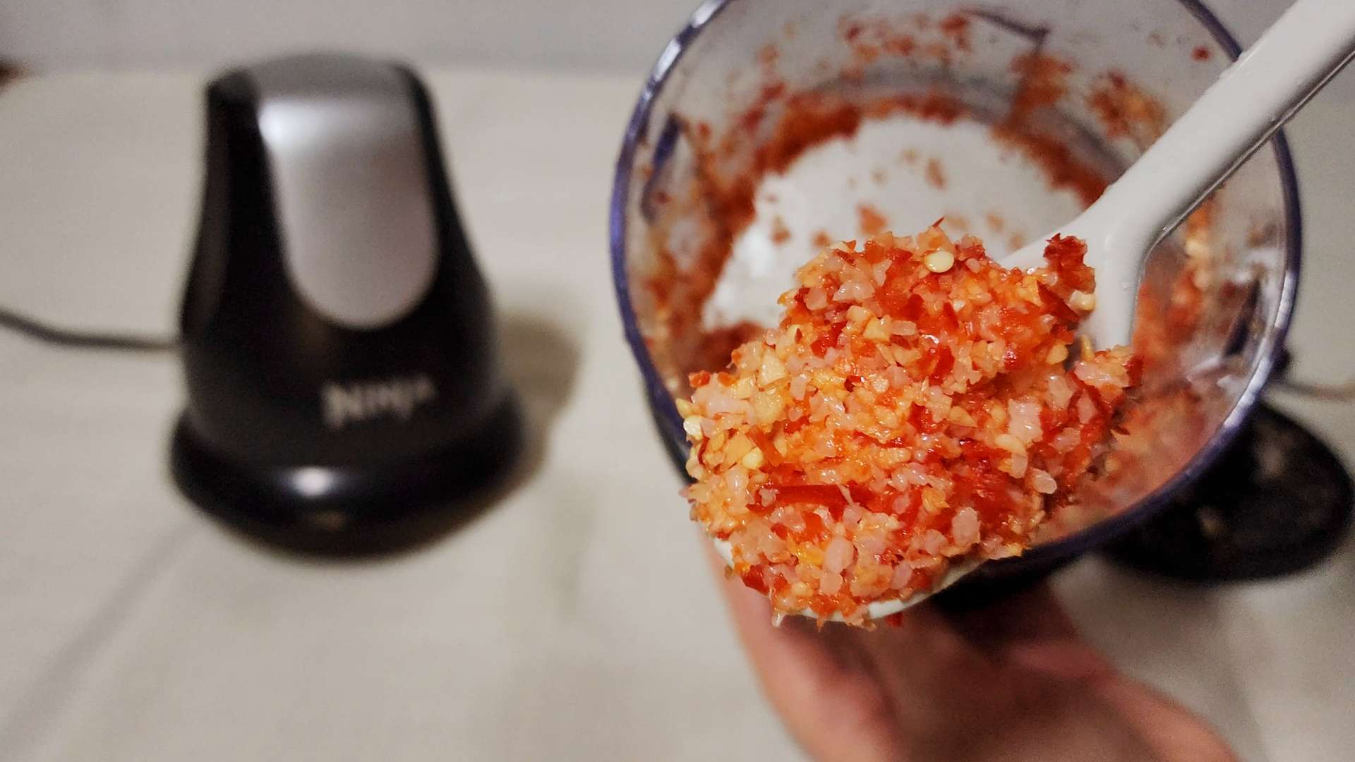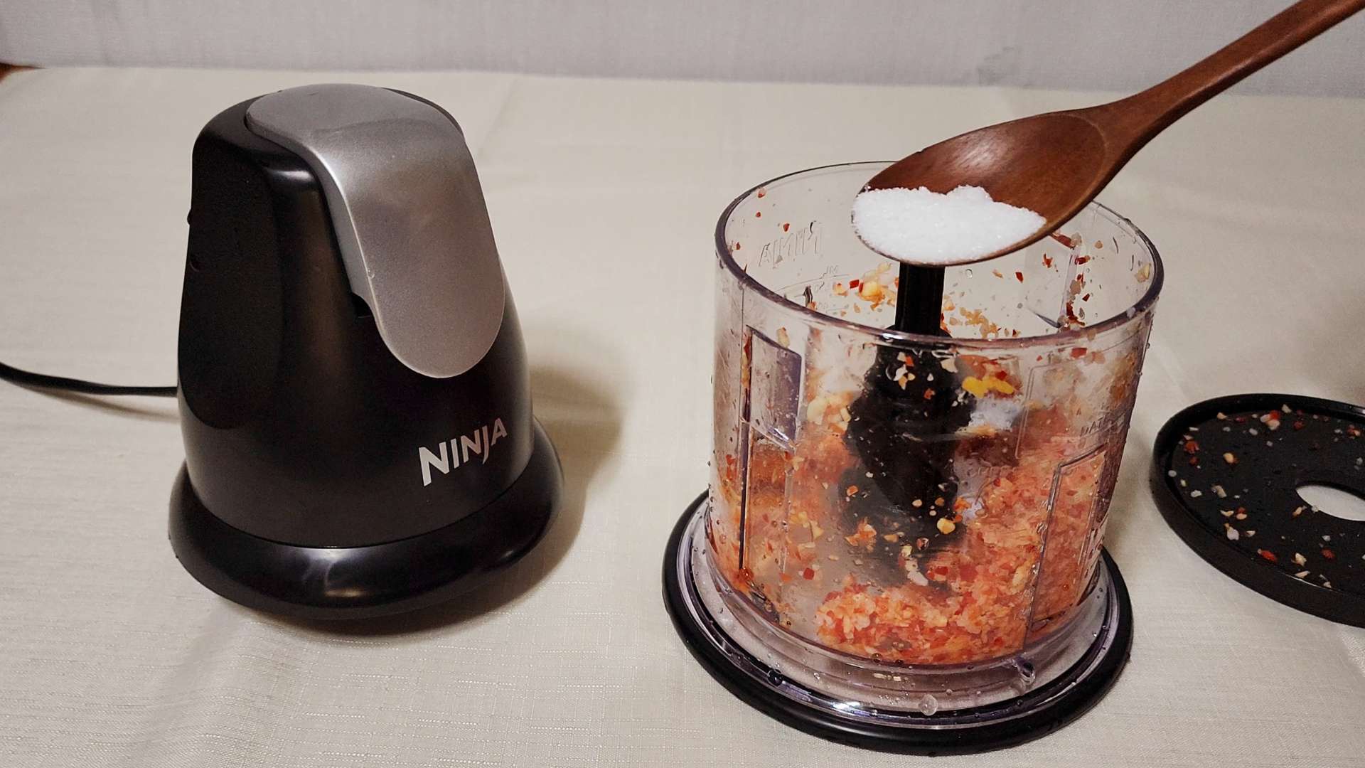 소금 0.5T, 설탕 0.5T, 고춧가루 2T, 매실청 1T, 멸치액젓 1T을 믹서기에 넣고 갈아줍니다.