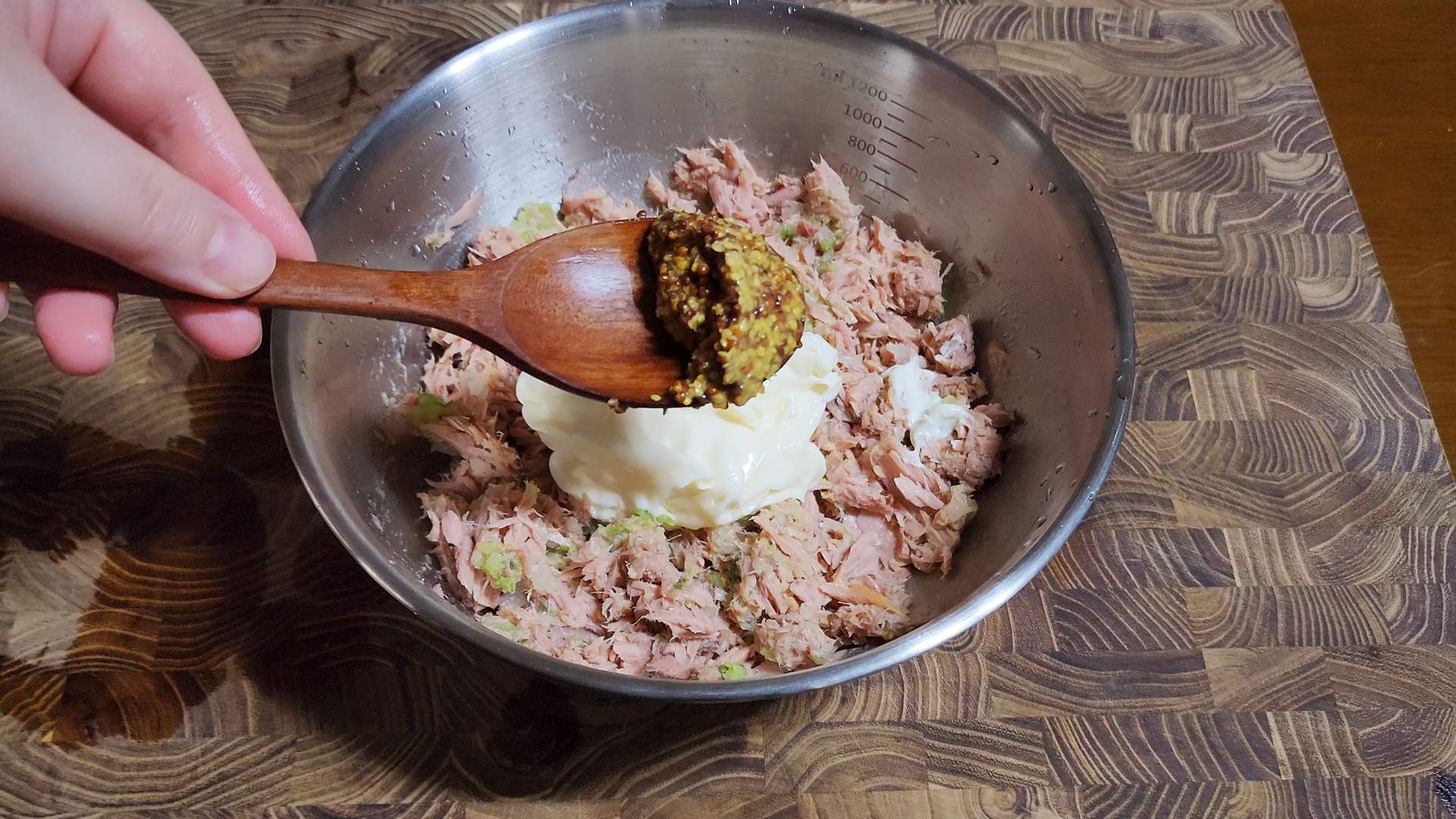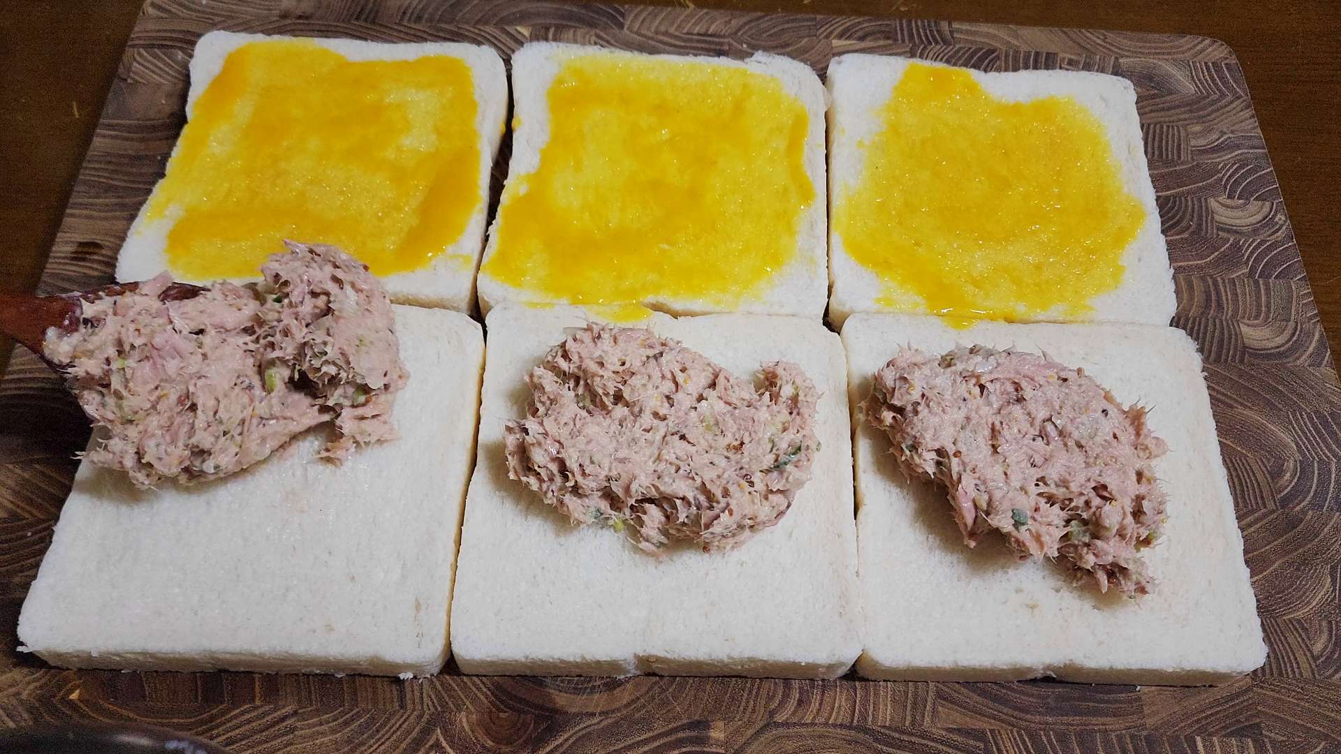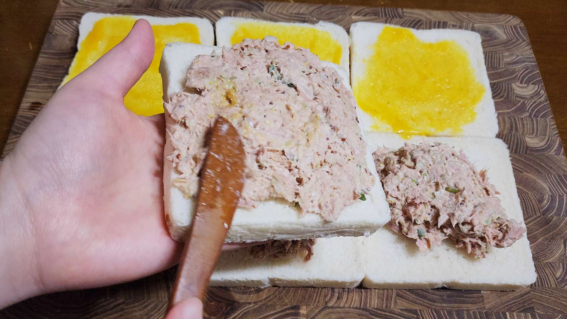 다른 한쪽 면에는 참치스프레드를 발라줍니다.