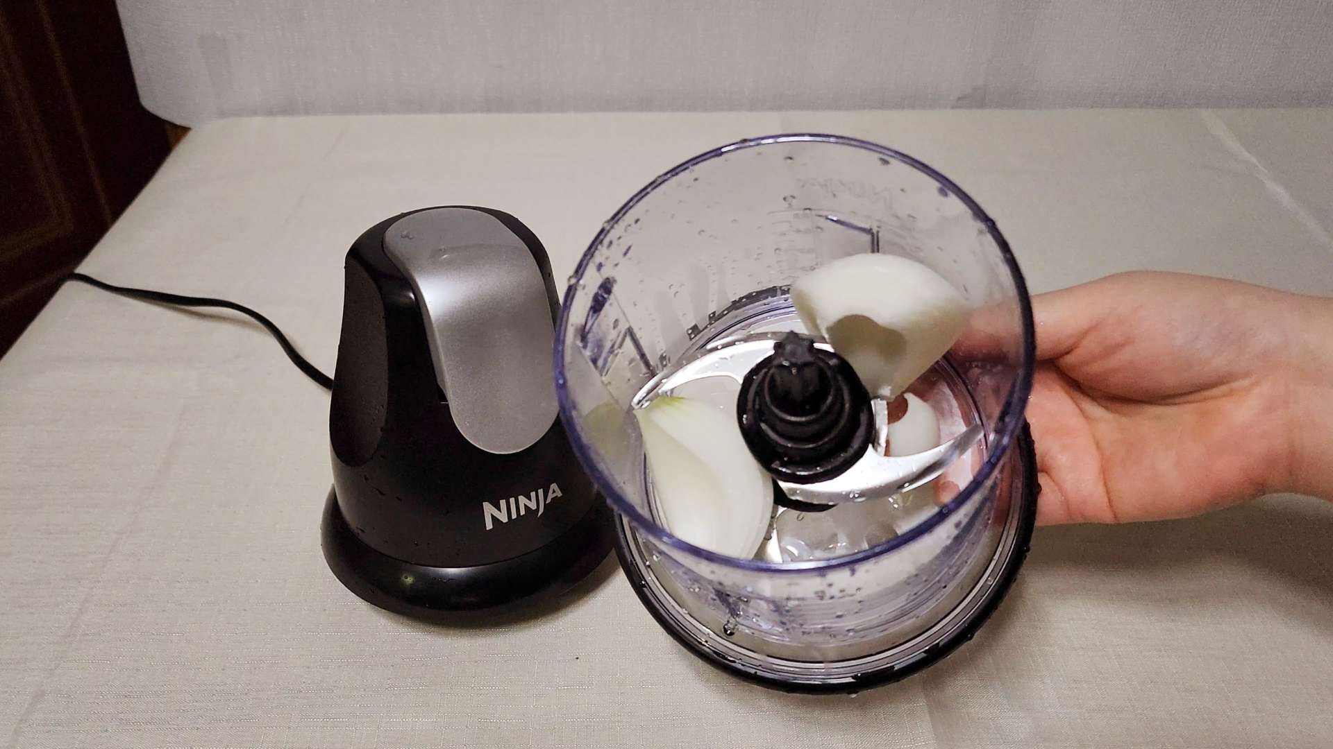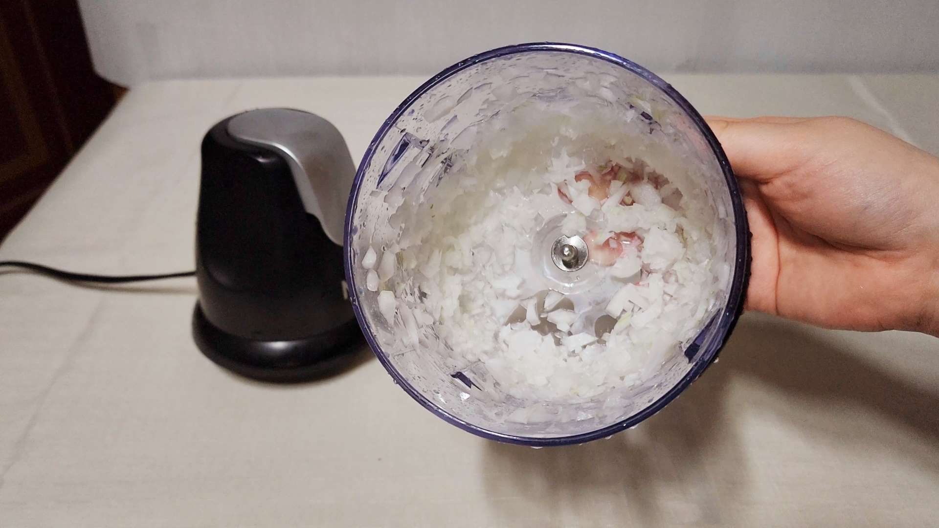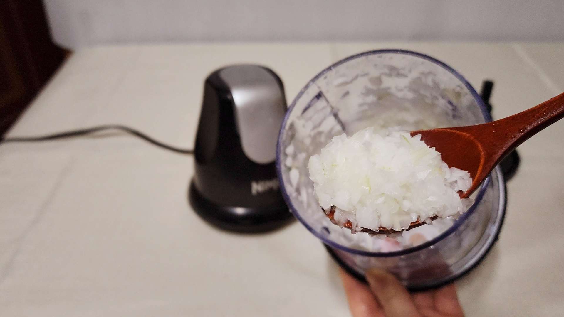 양파 1/2개는 큼직하게 잘라 믹서기에 넣고 다져줍니다.