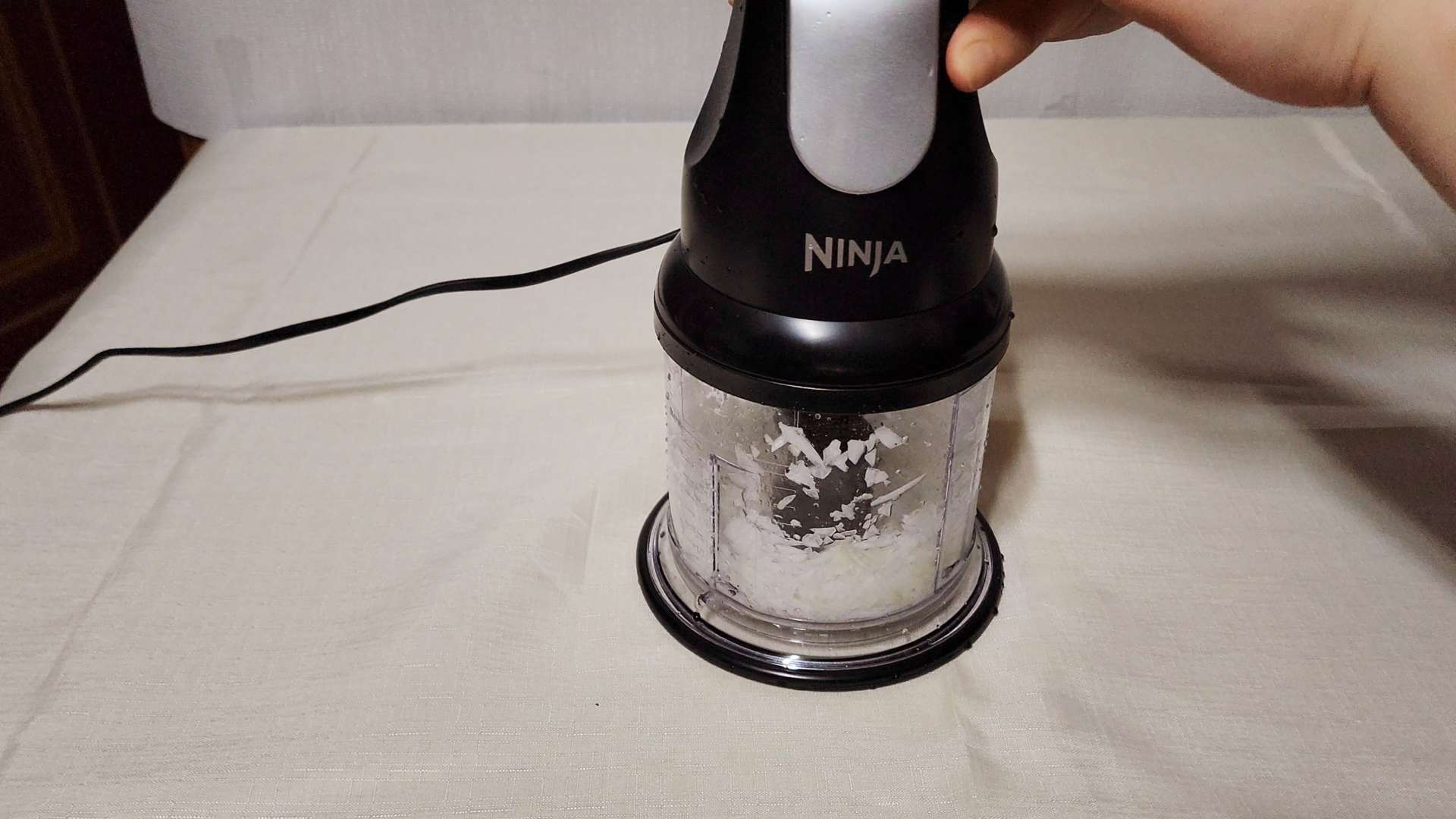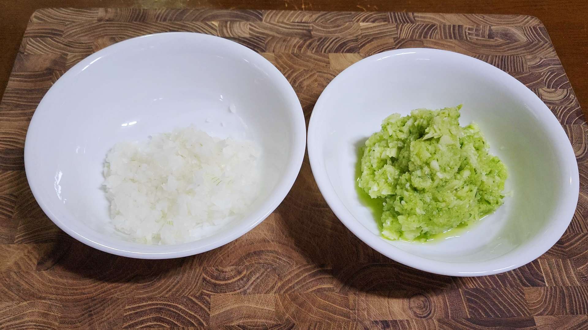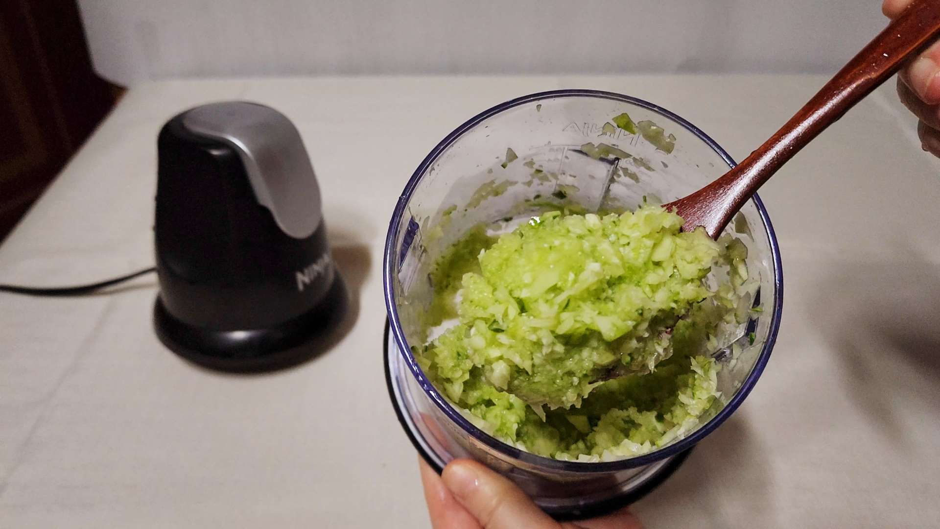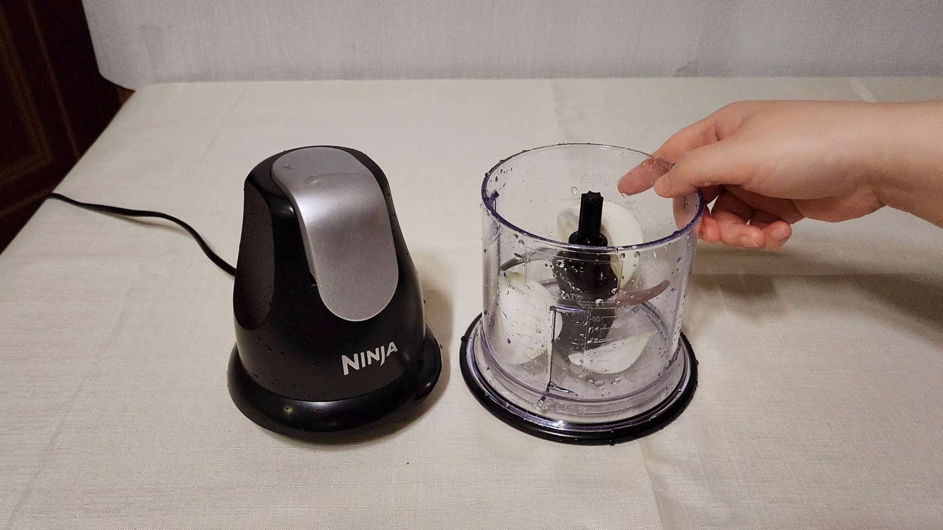 양파 1/2개는 큼직하게 잘라 믹서기에 넣고 다져줍니다.