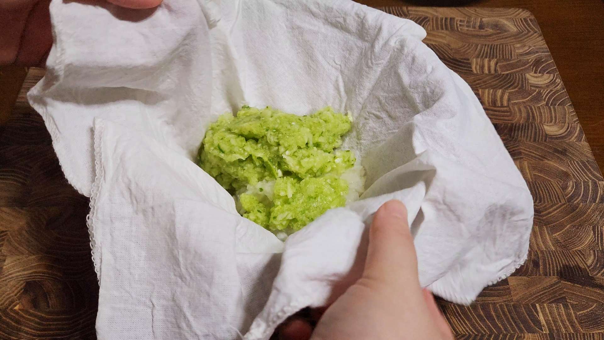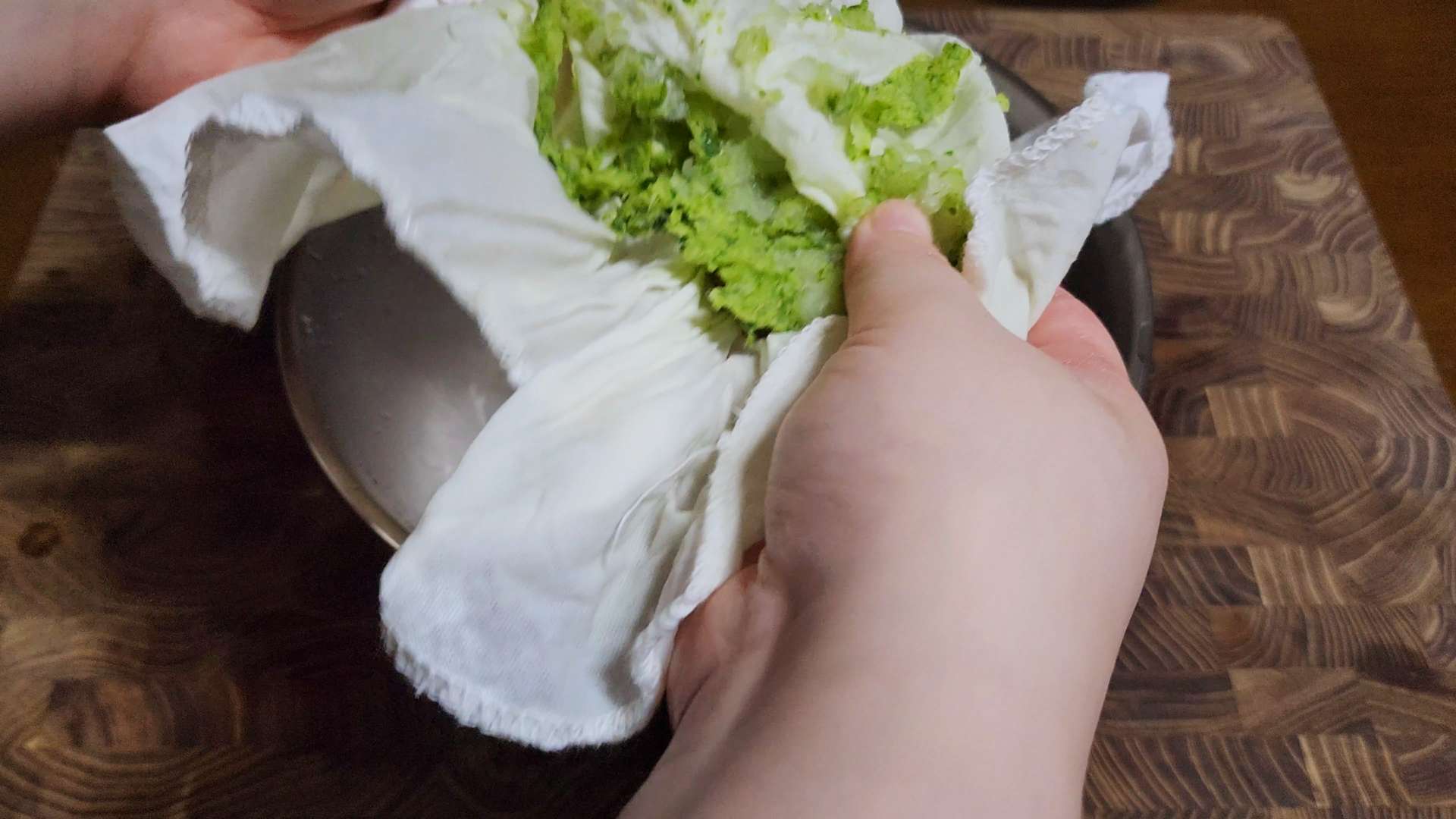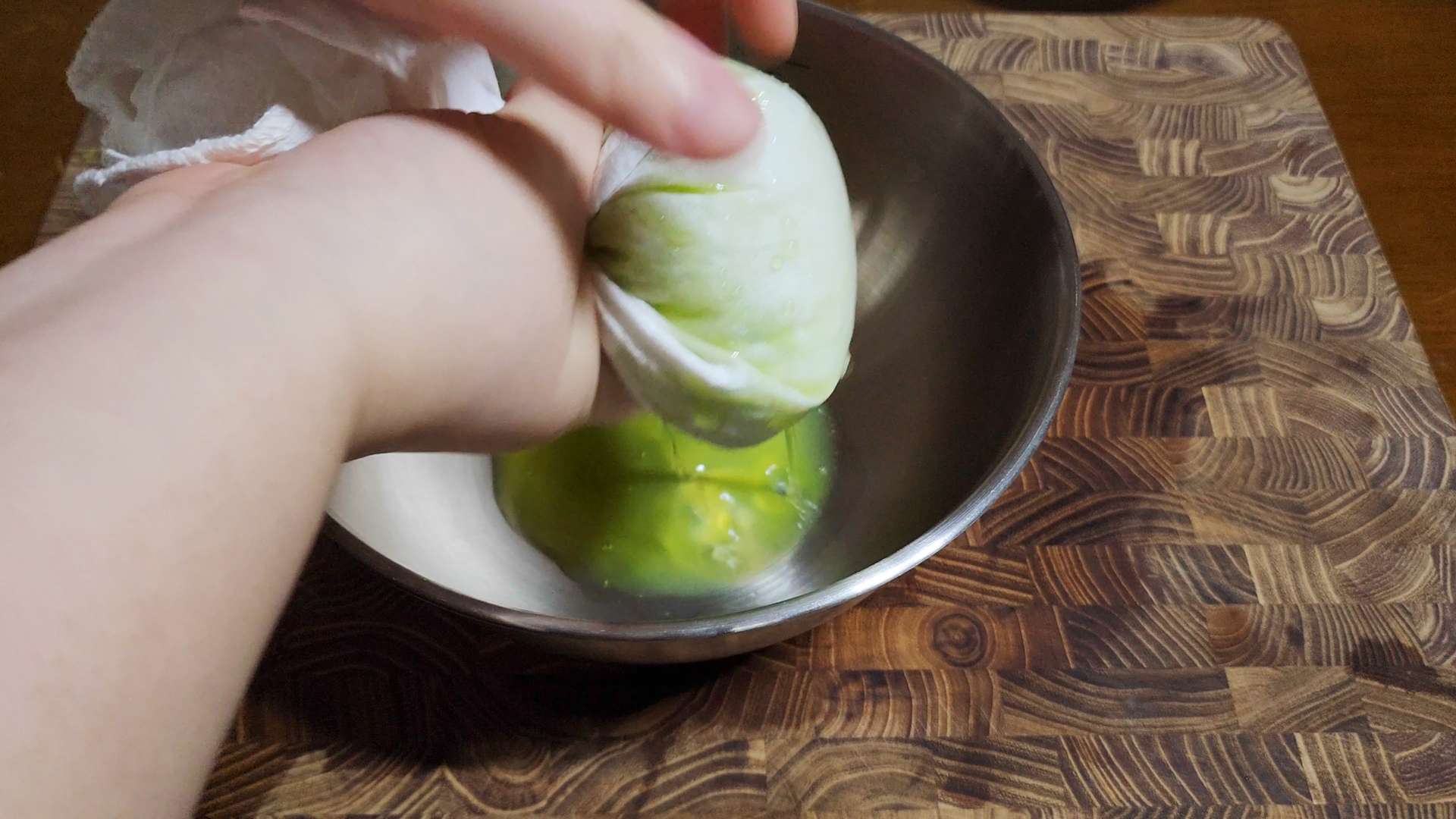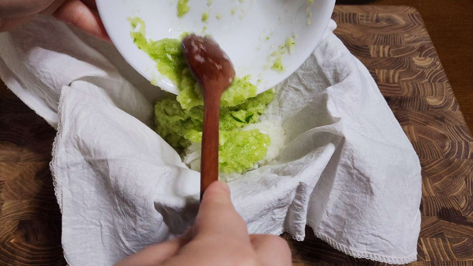 절인 오이, 양파는 면포에 넣고 물기를 꼭 짜줍니다.