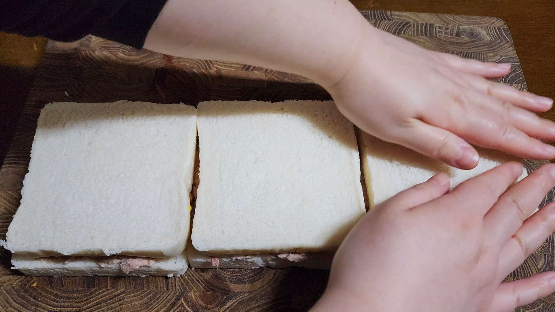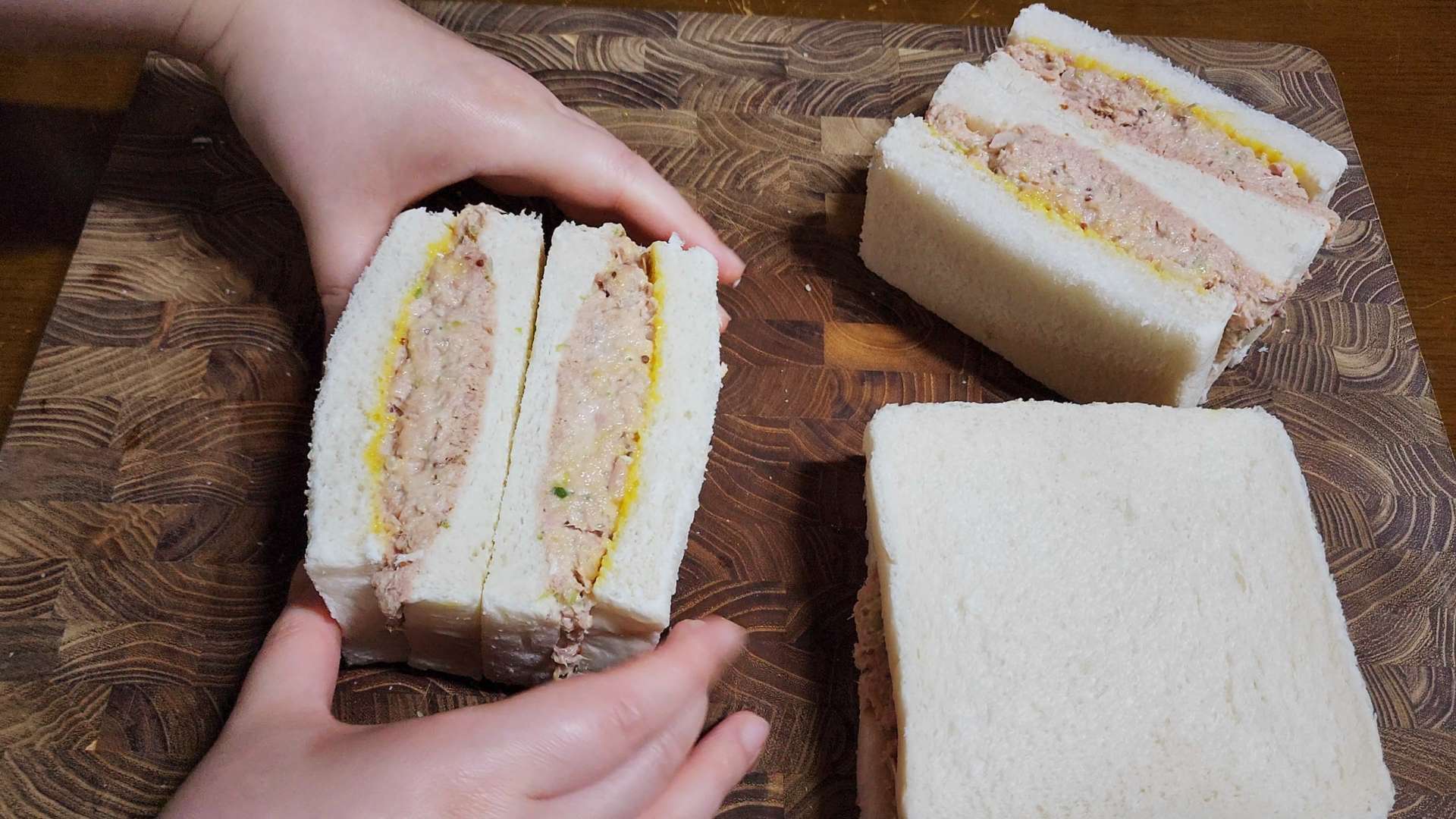 참치샌드위치는 먹기 좋게 반으로 잘라줍니다.