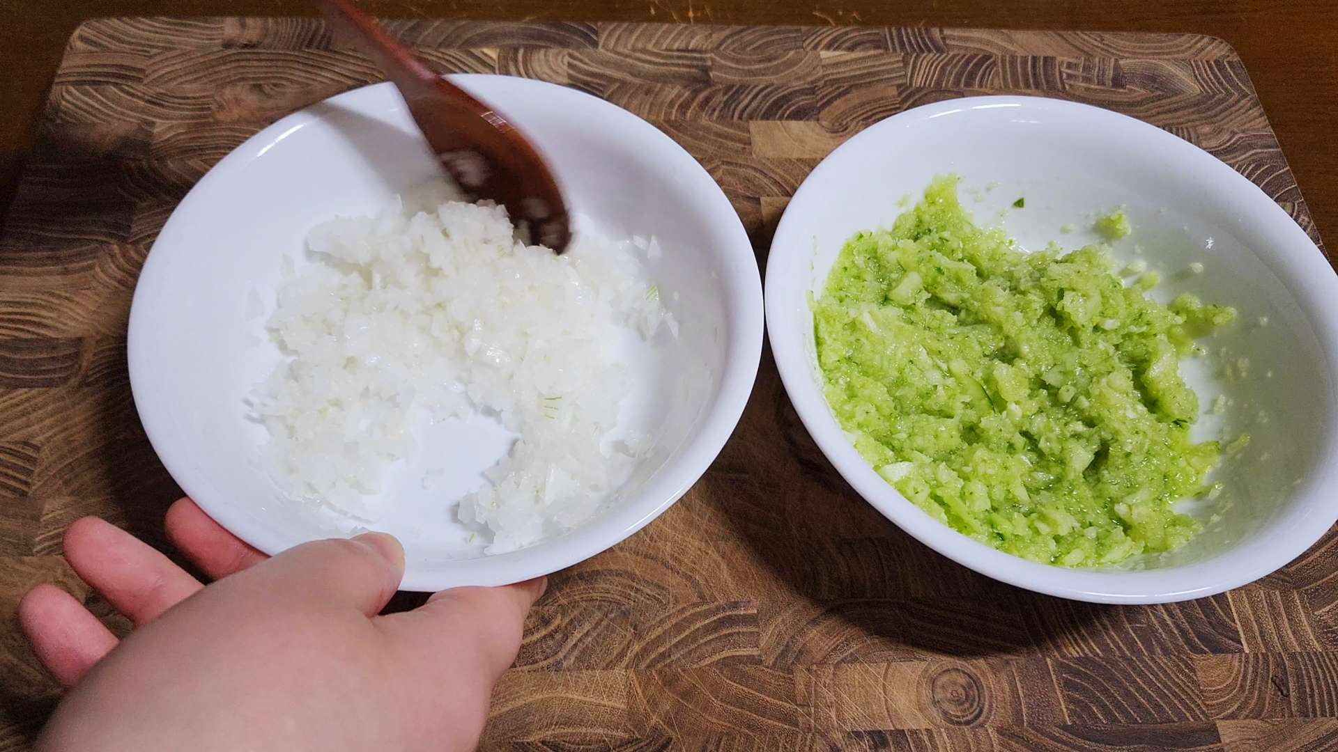 오이, 양파에 각각 소금 0.5T 넣고 버무려 15분 정도 절여줍니다.