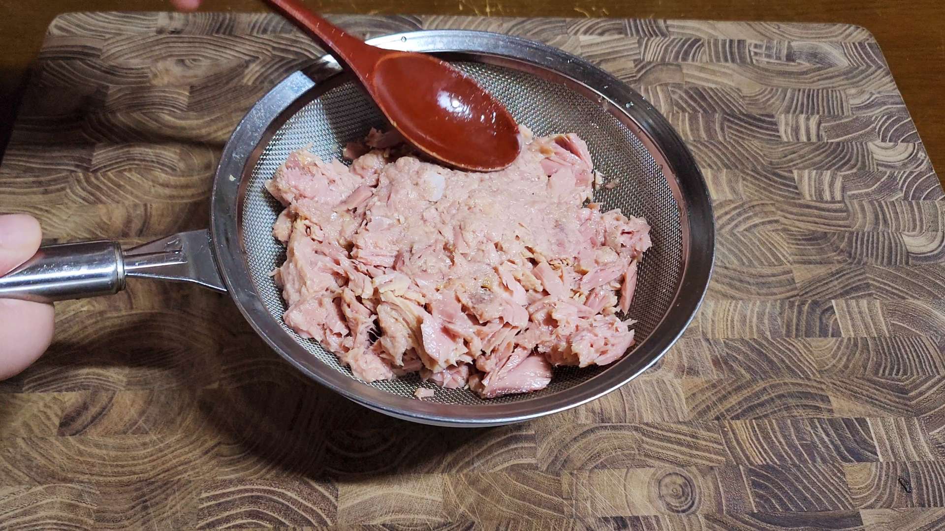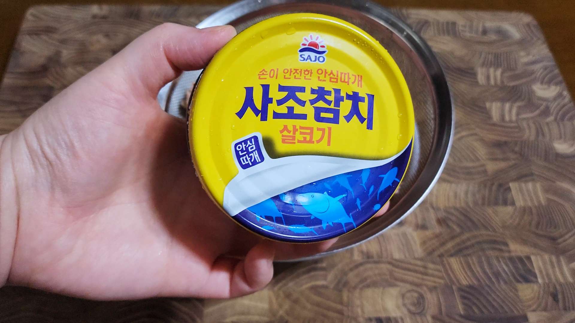 참치 통조림 2개는 채반에 밭쳐 기름을 제거해줍니다.