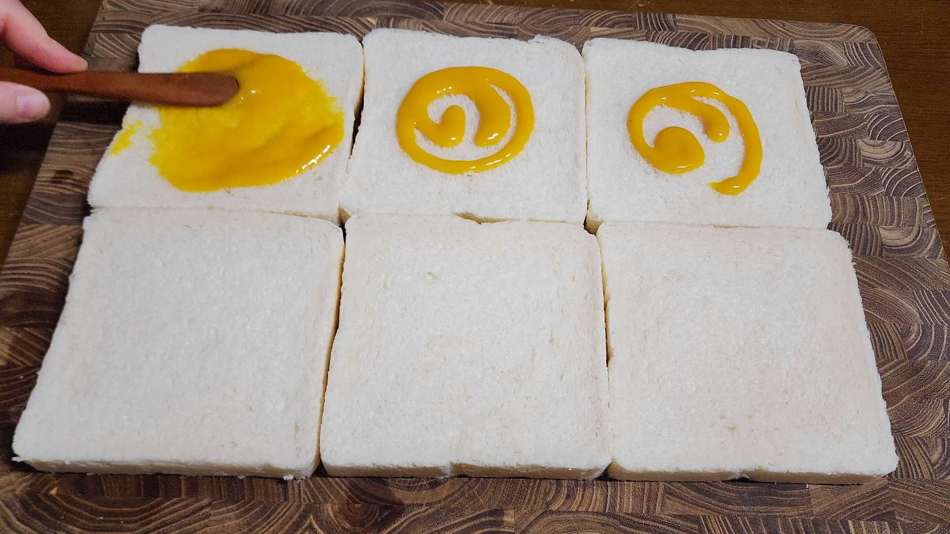 식빵 한쪽 면에는 허니머스터드를 발라줍니다.