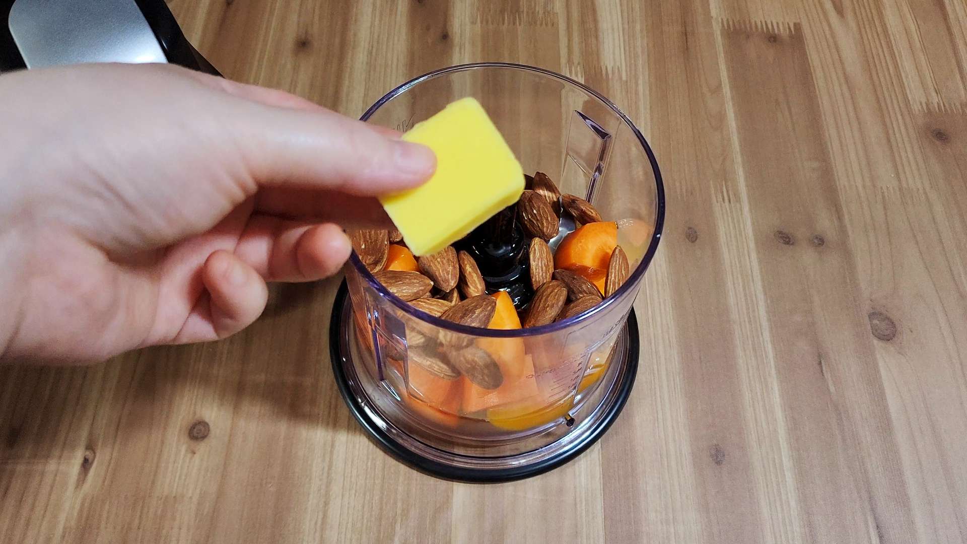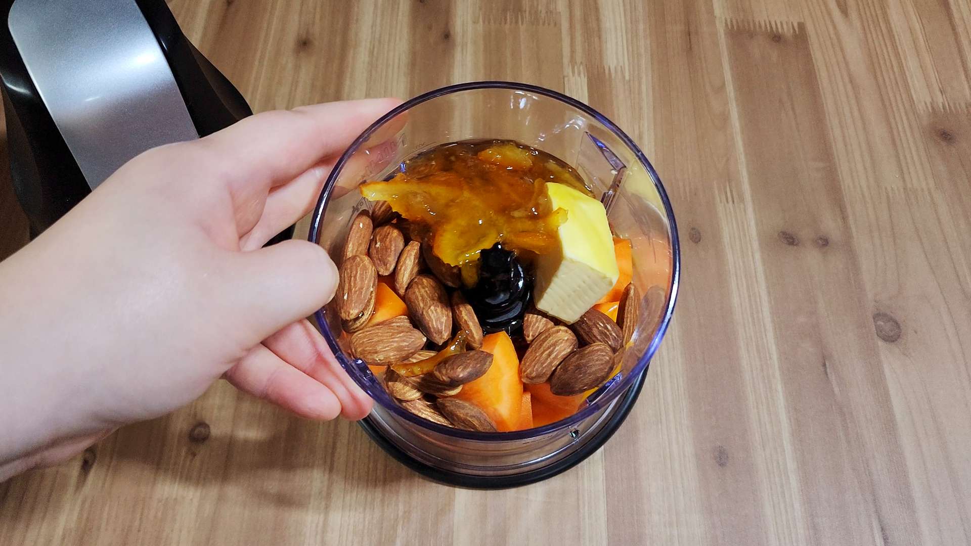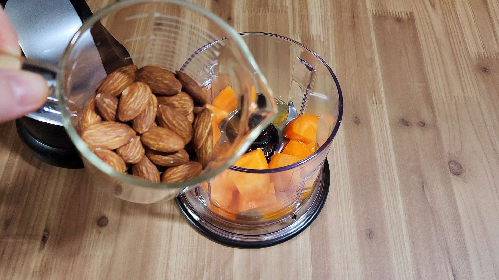 블렌더에 달걀 3개, 당근 150g, 아몬드 100g, 버터 1T, 유자청 1T 순으로 넣고 2분 정도 갈아줍니다.