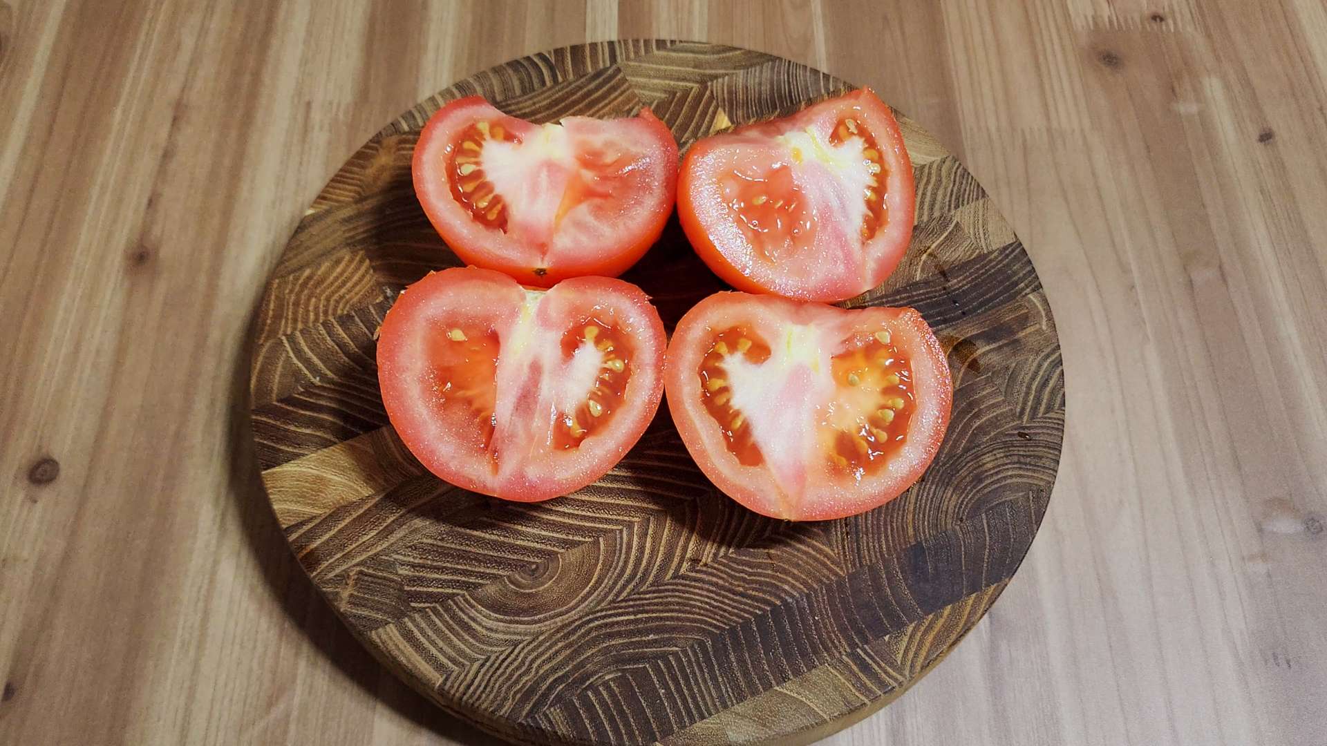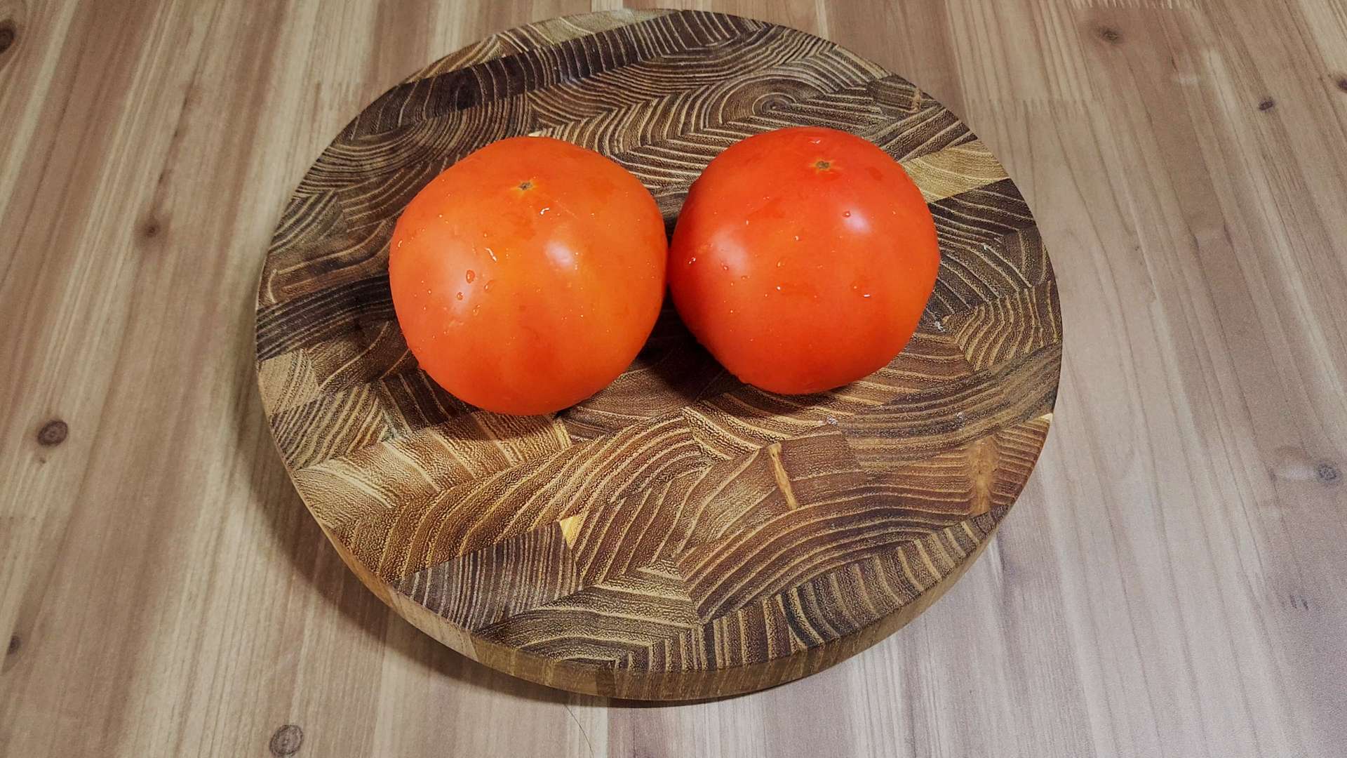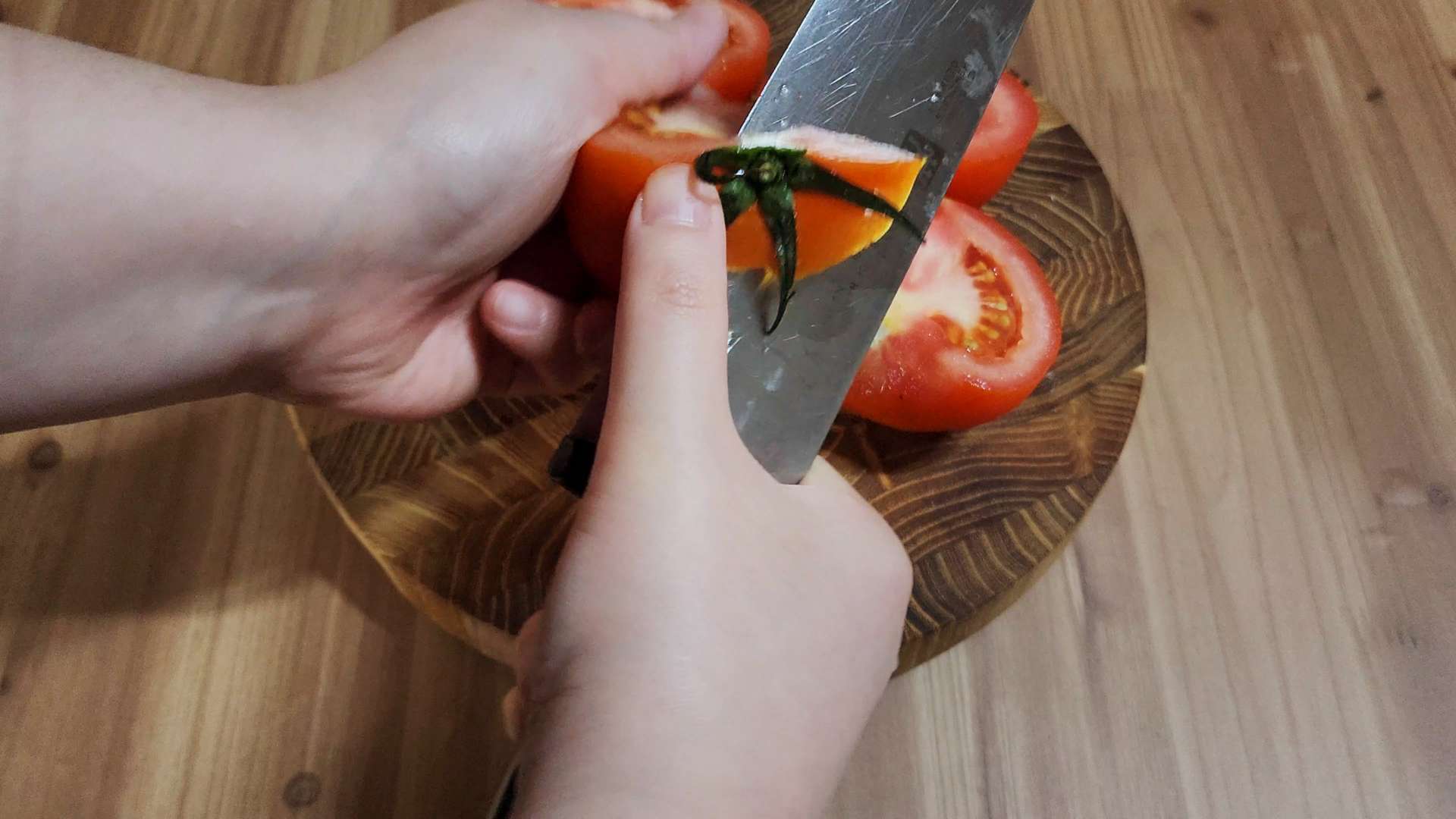 토마토는 반으로 잘라 꼭지를 제거해줍니다.