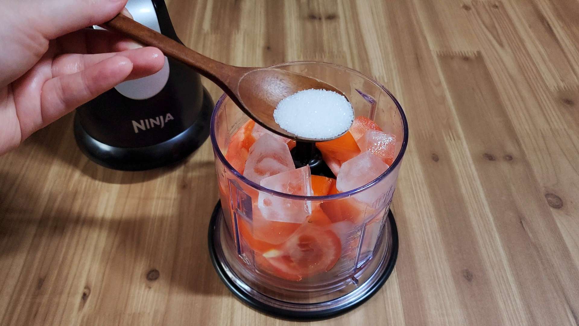 블렌더에 토마토 2개, 얼음 5개, 설탕 1T, 매실청 1T을 넣고 갈아줍니다.