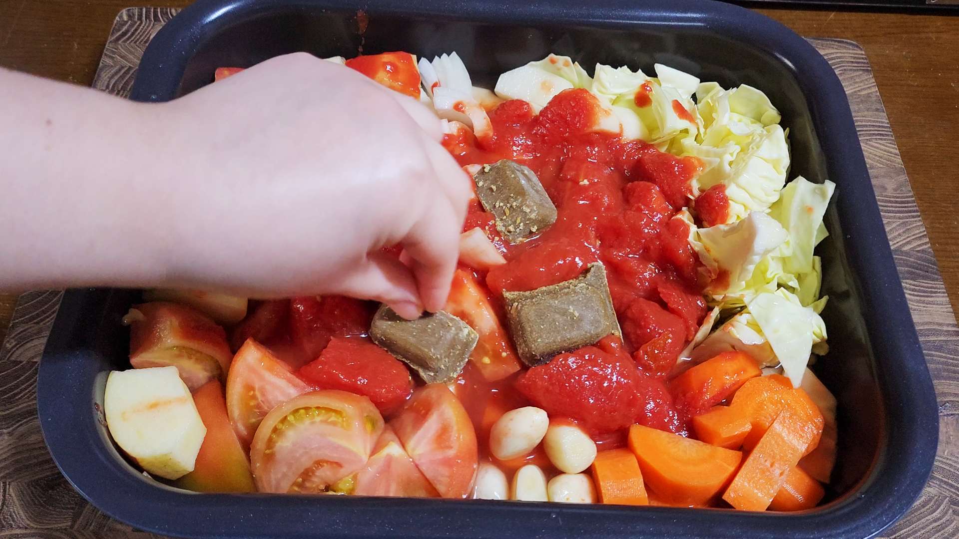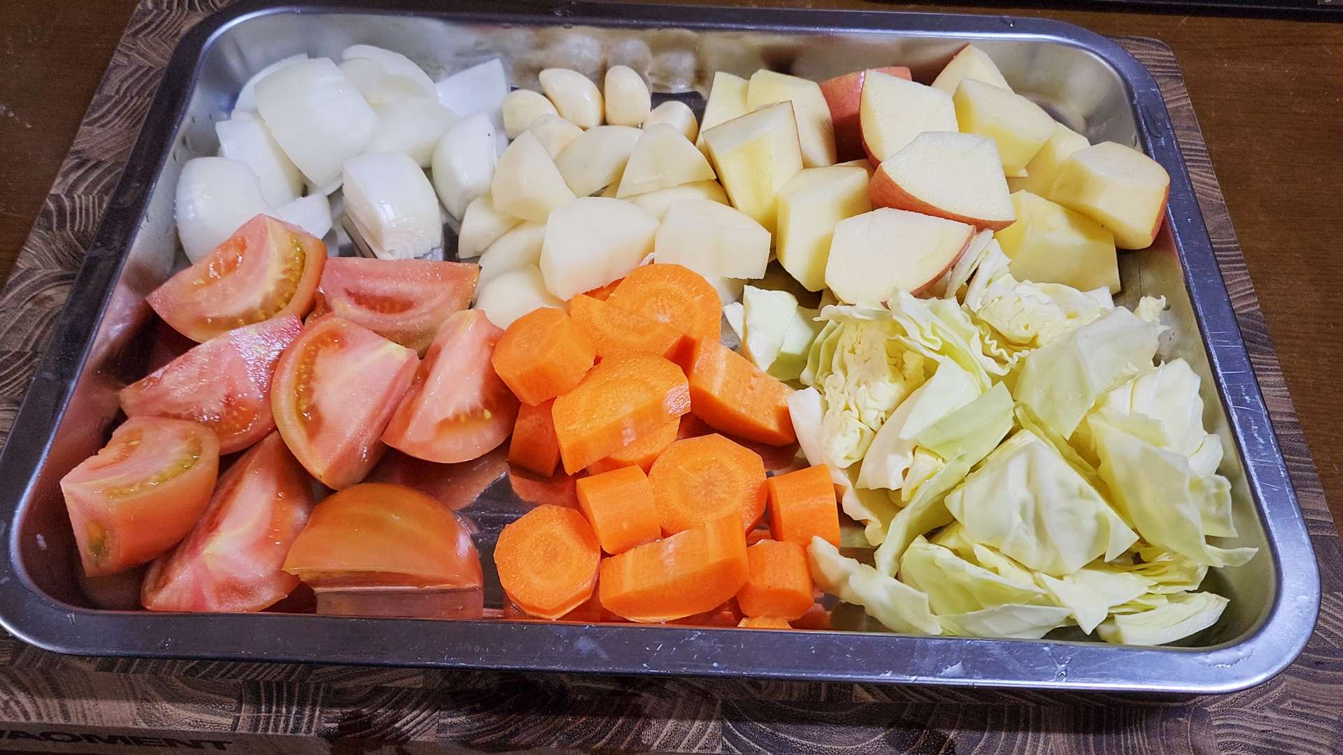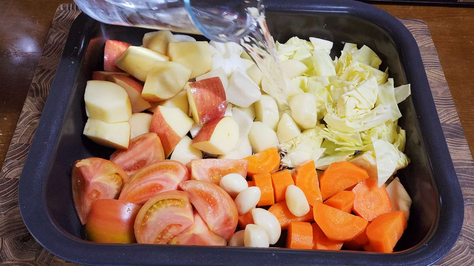 콤비팬에 양배추, 당근, 감자, 양파, 토마토, 사과, 마늘, 물 200ml를 넣어줍니다.