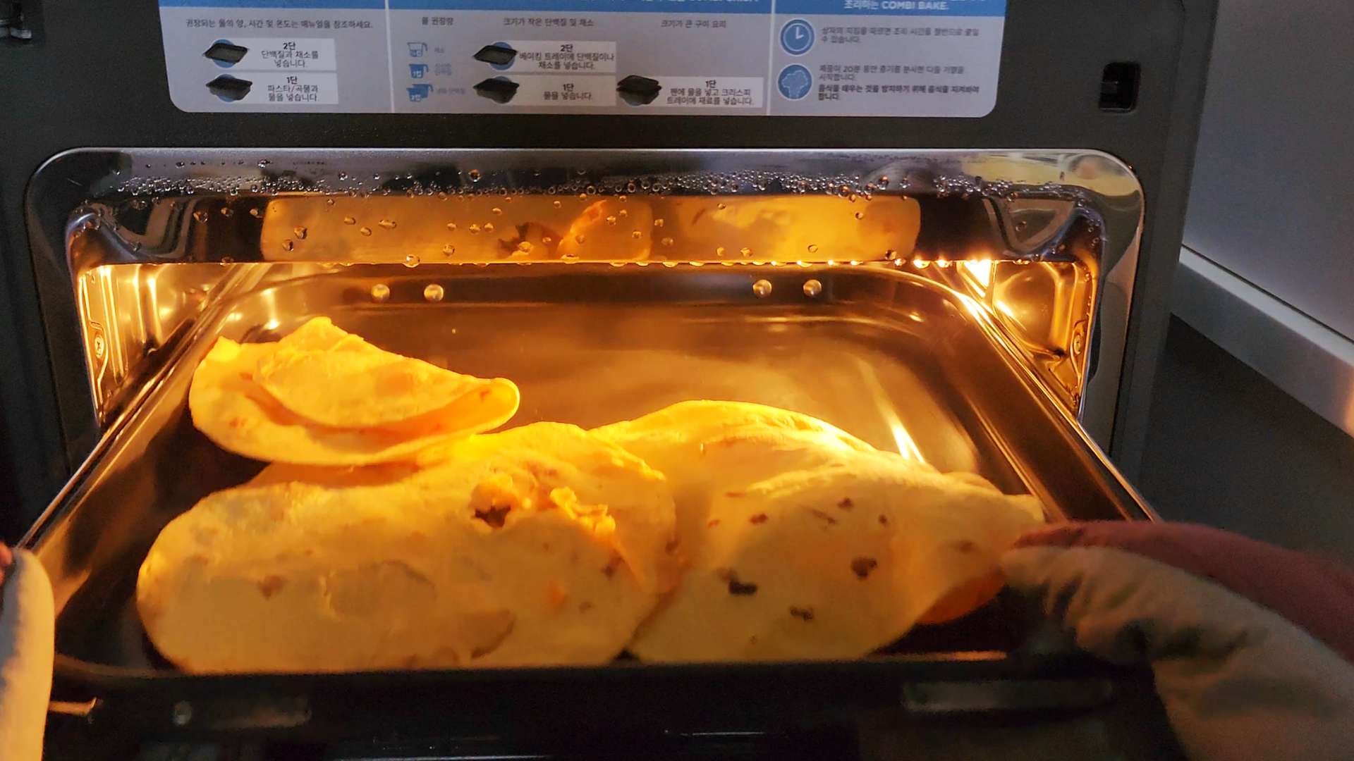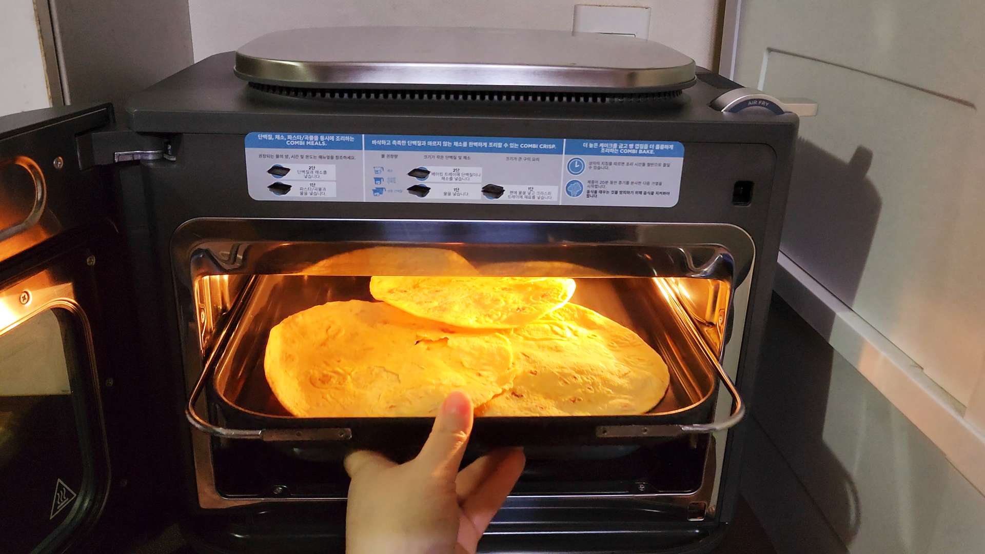 2단에는 베이킹 트레이를 넣어 난을 구워줄게요.