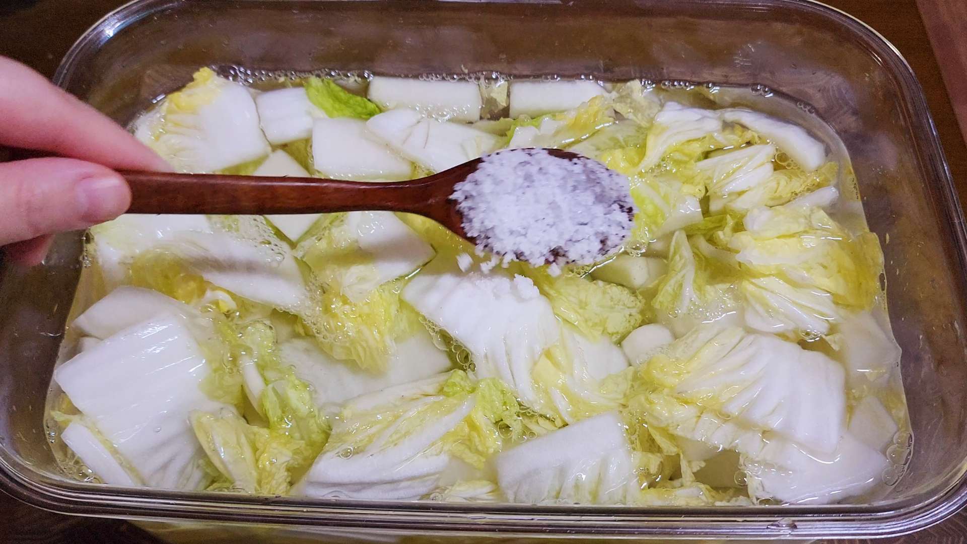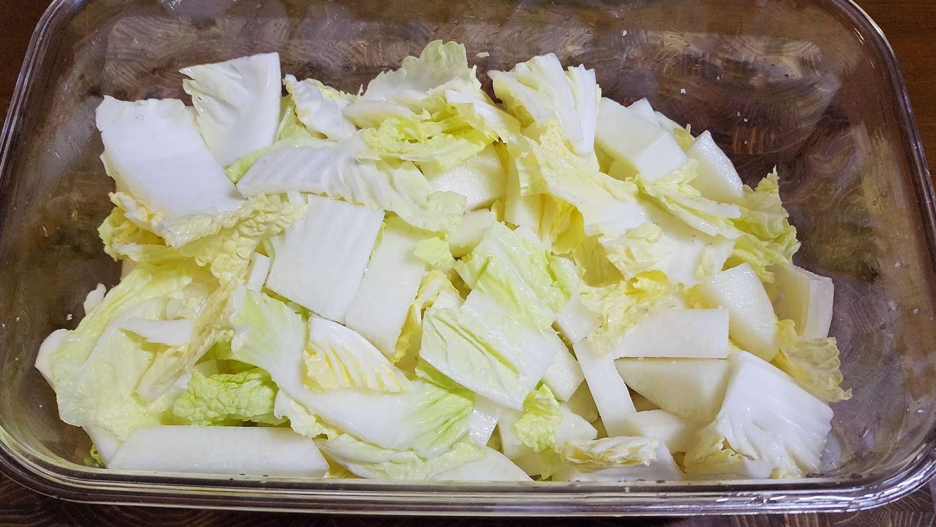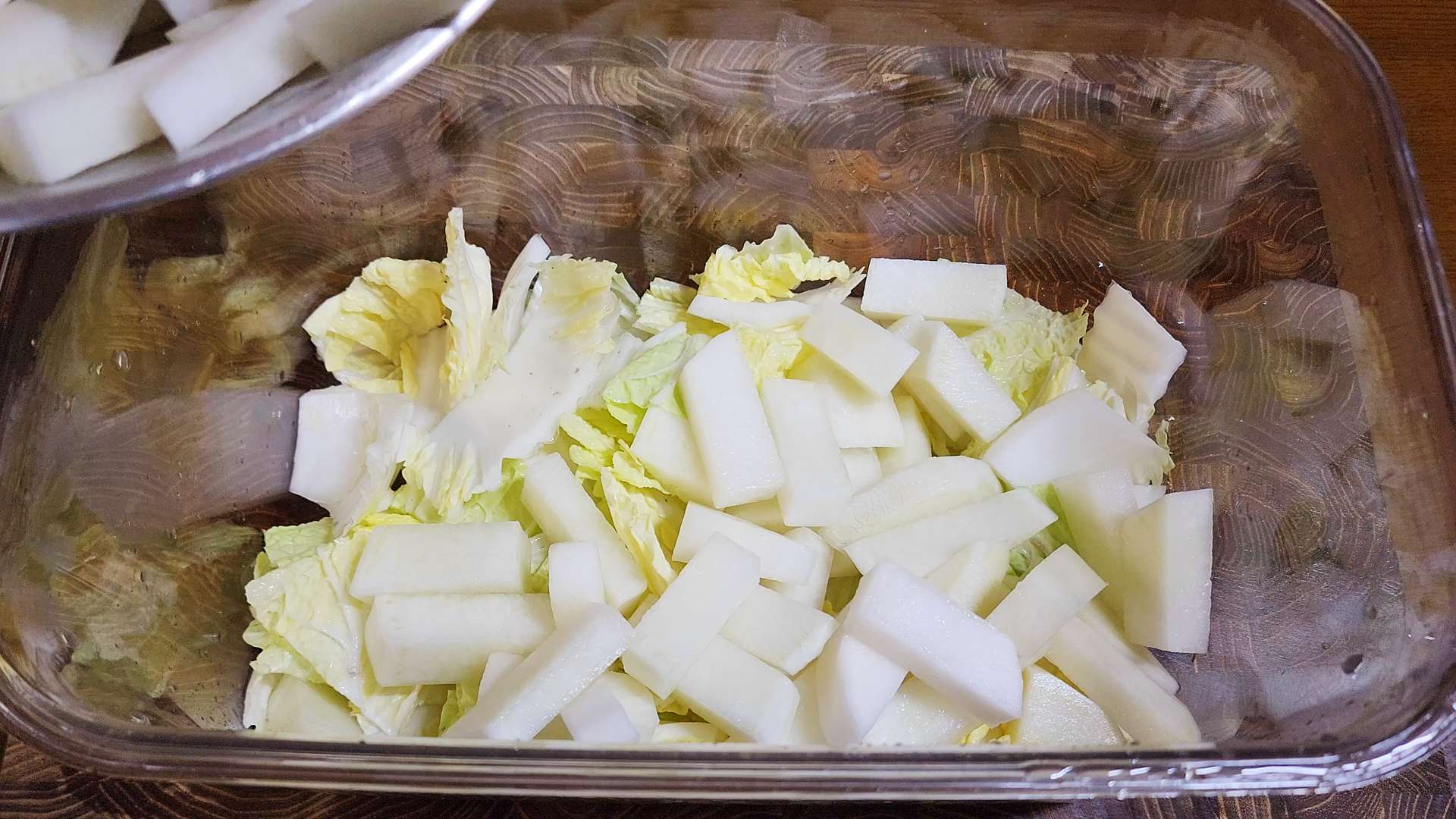 밀폐용기에 배추, 무를 담아줍니다.