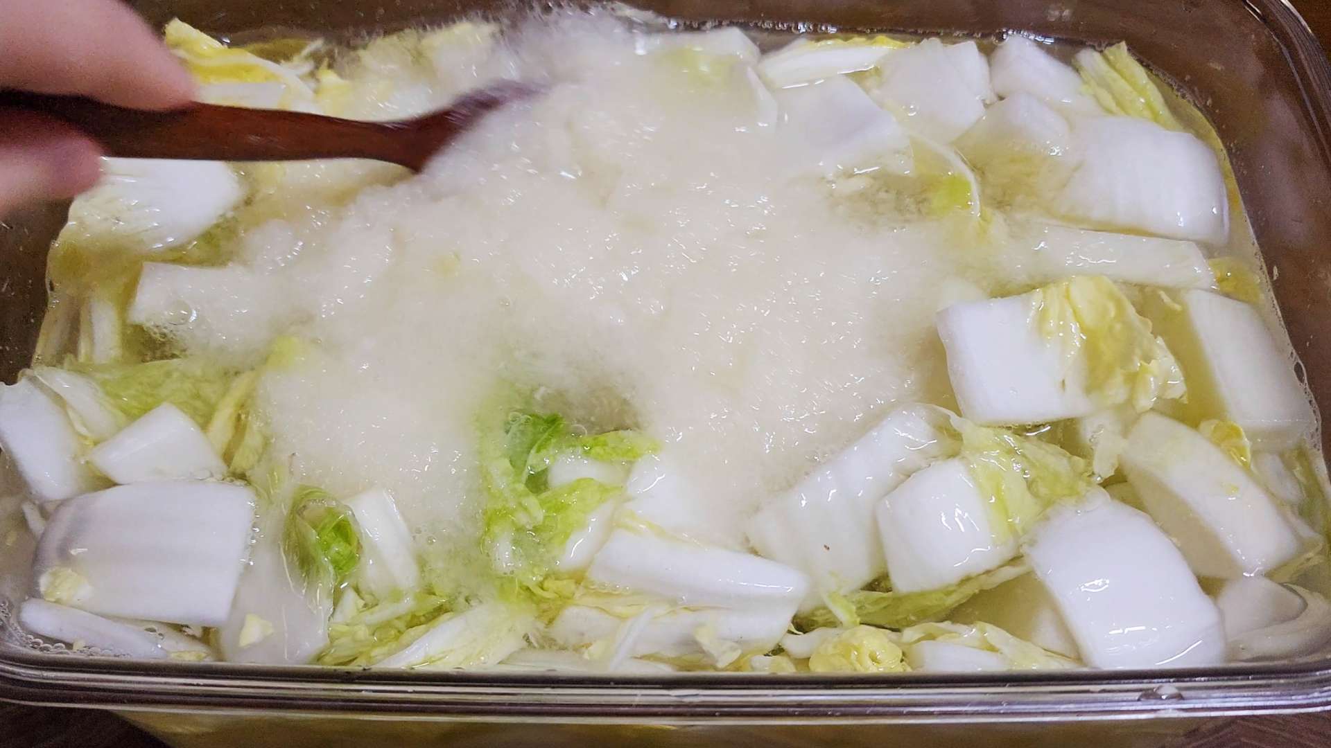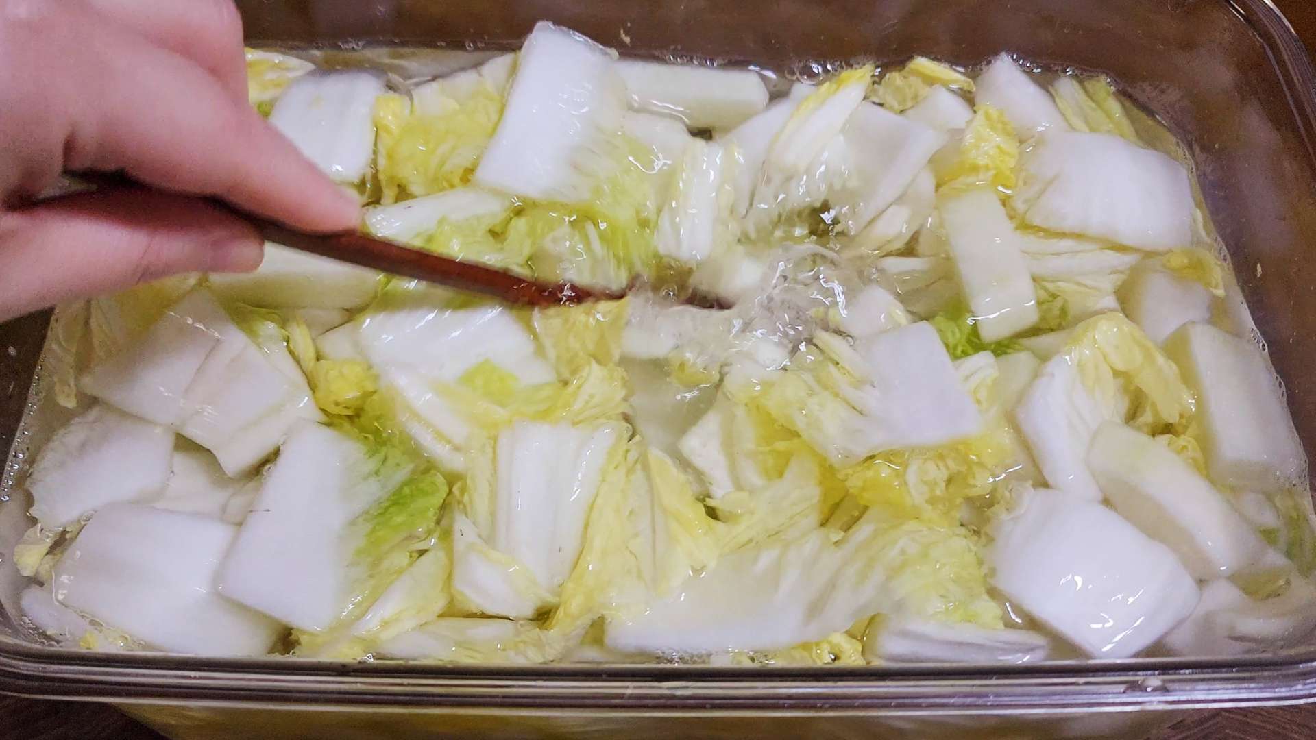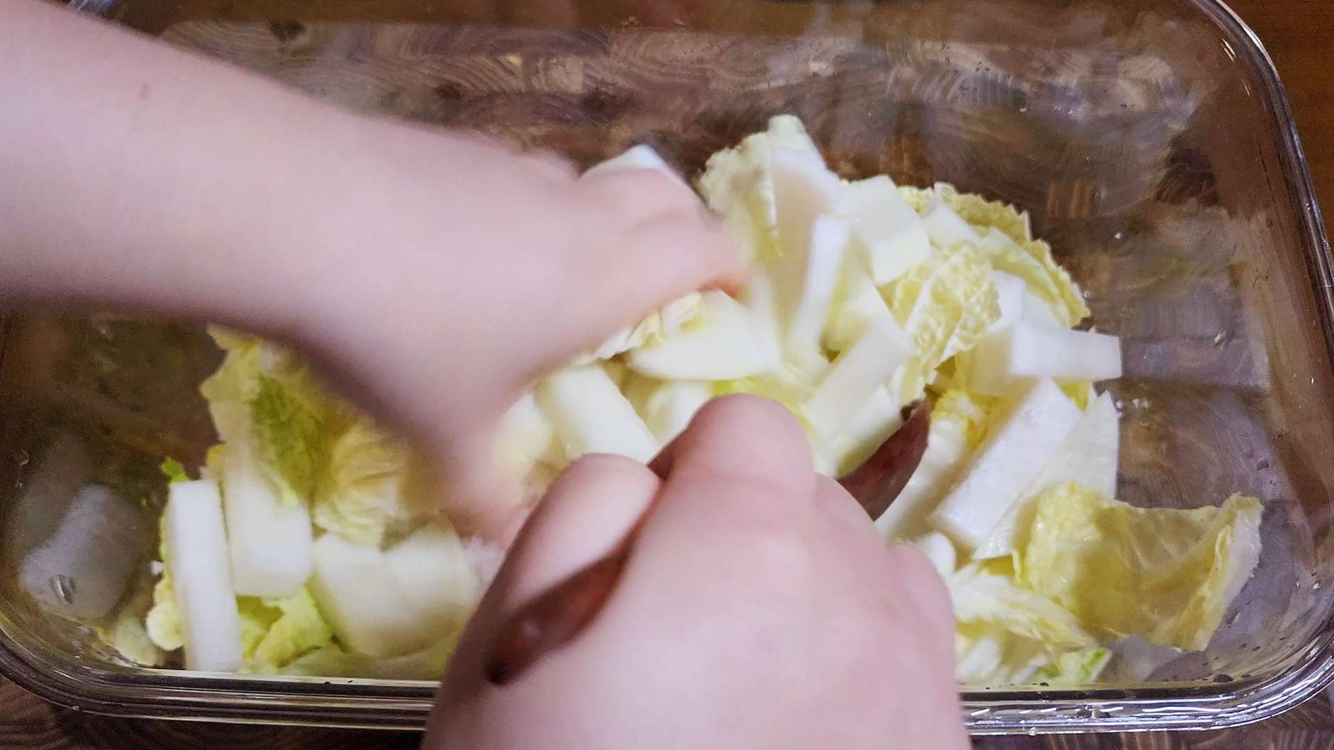 밀폐용기에 배추, 무를 담아줍니다.