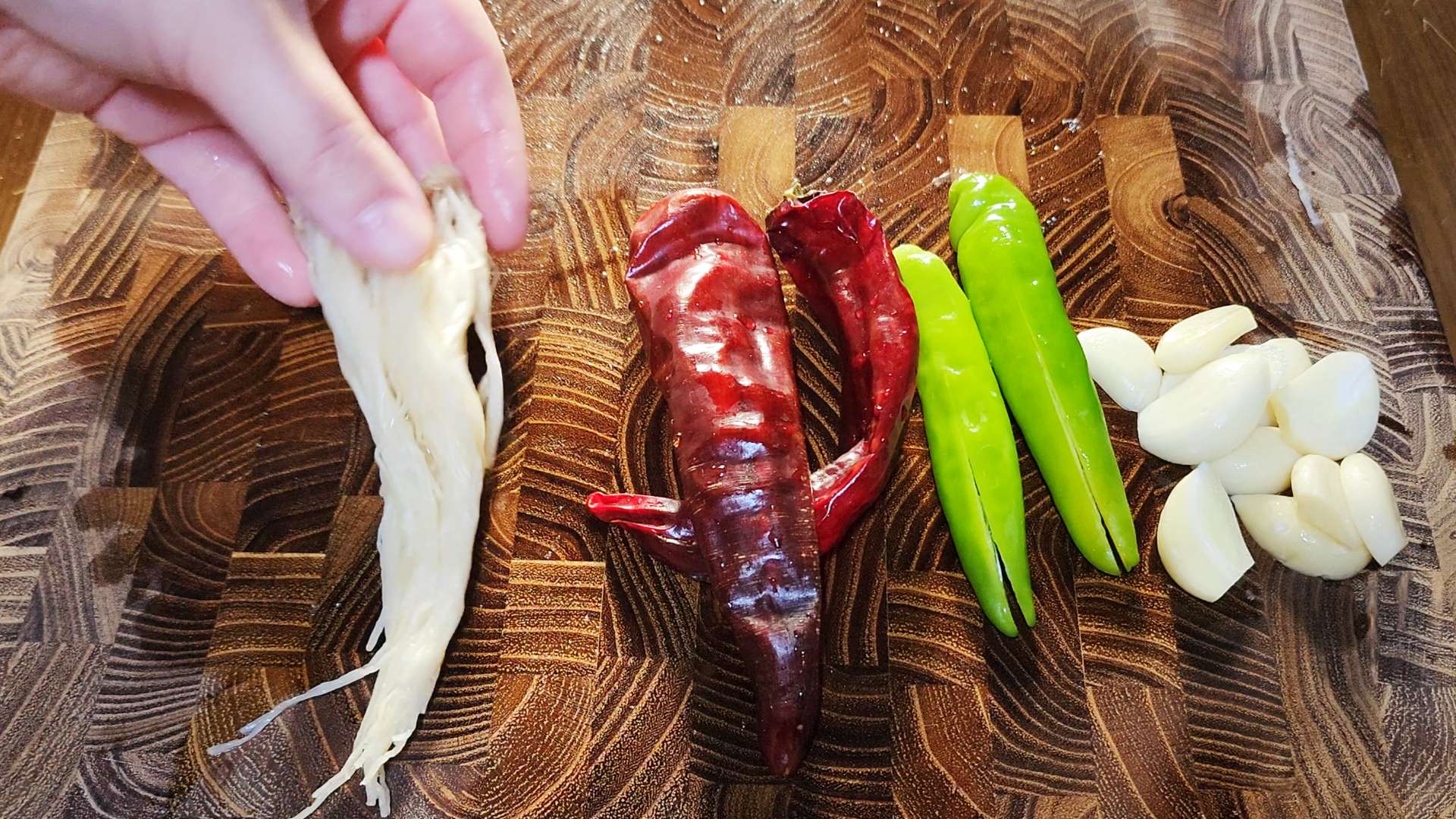 통마늘, 대파뿌리, 건고추 2개, 청양고추 2개를 넣어줍니다.