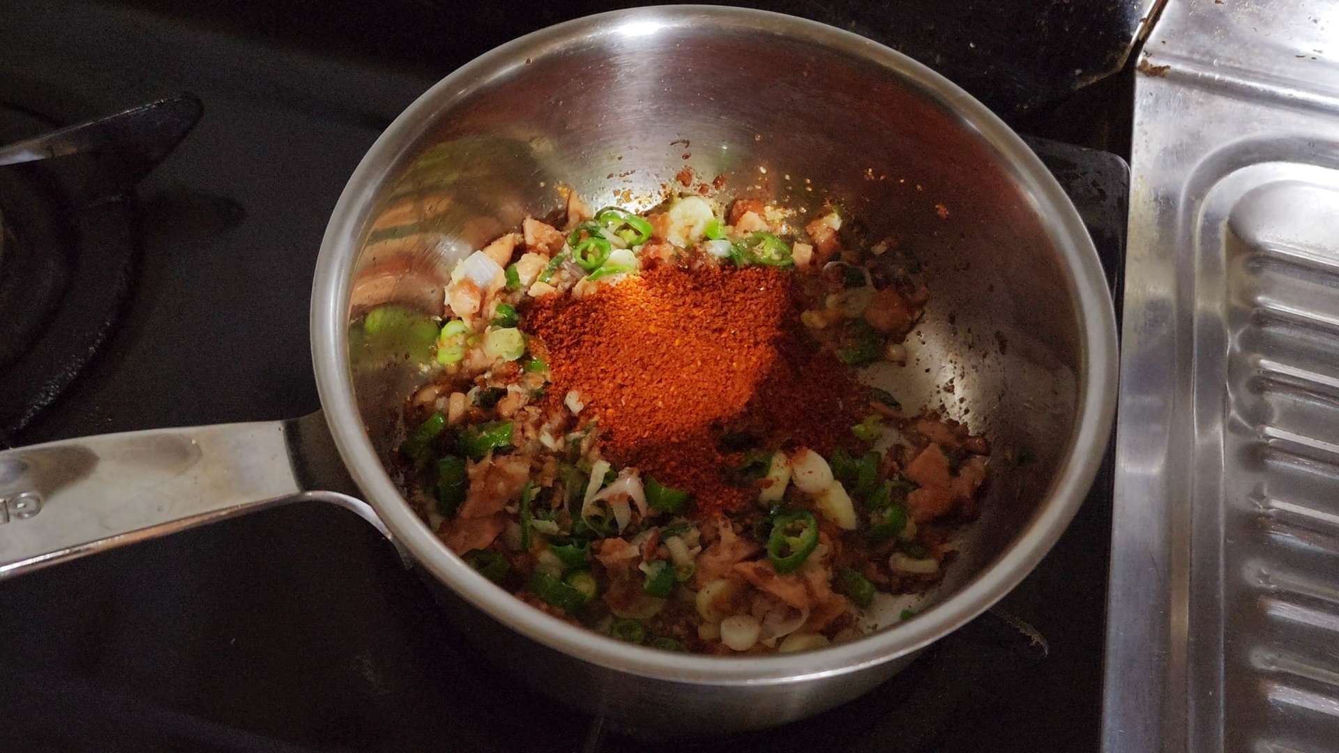 고춧가루 3T을 넣고 불을 끄고 2분 정도 볶아줍니다.