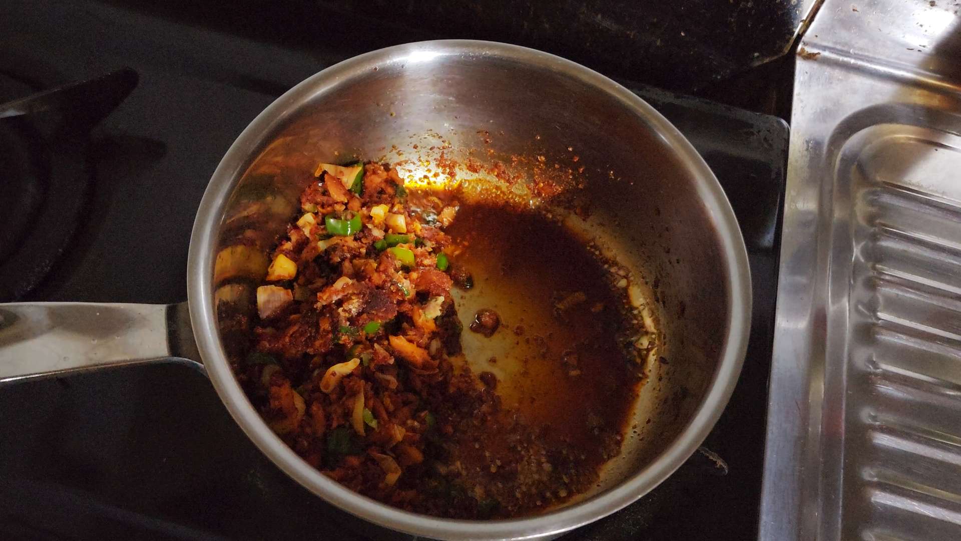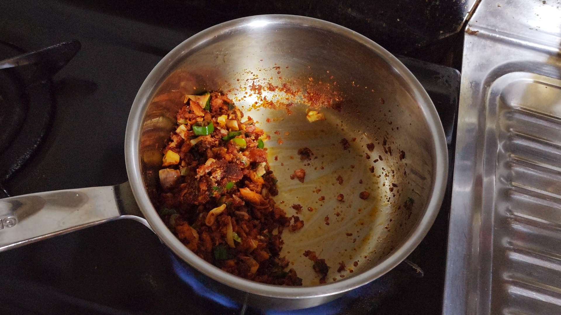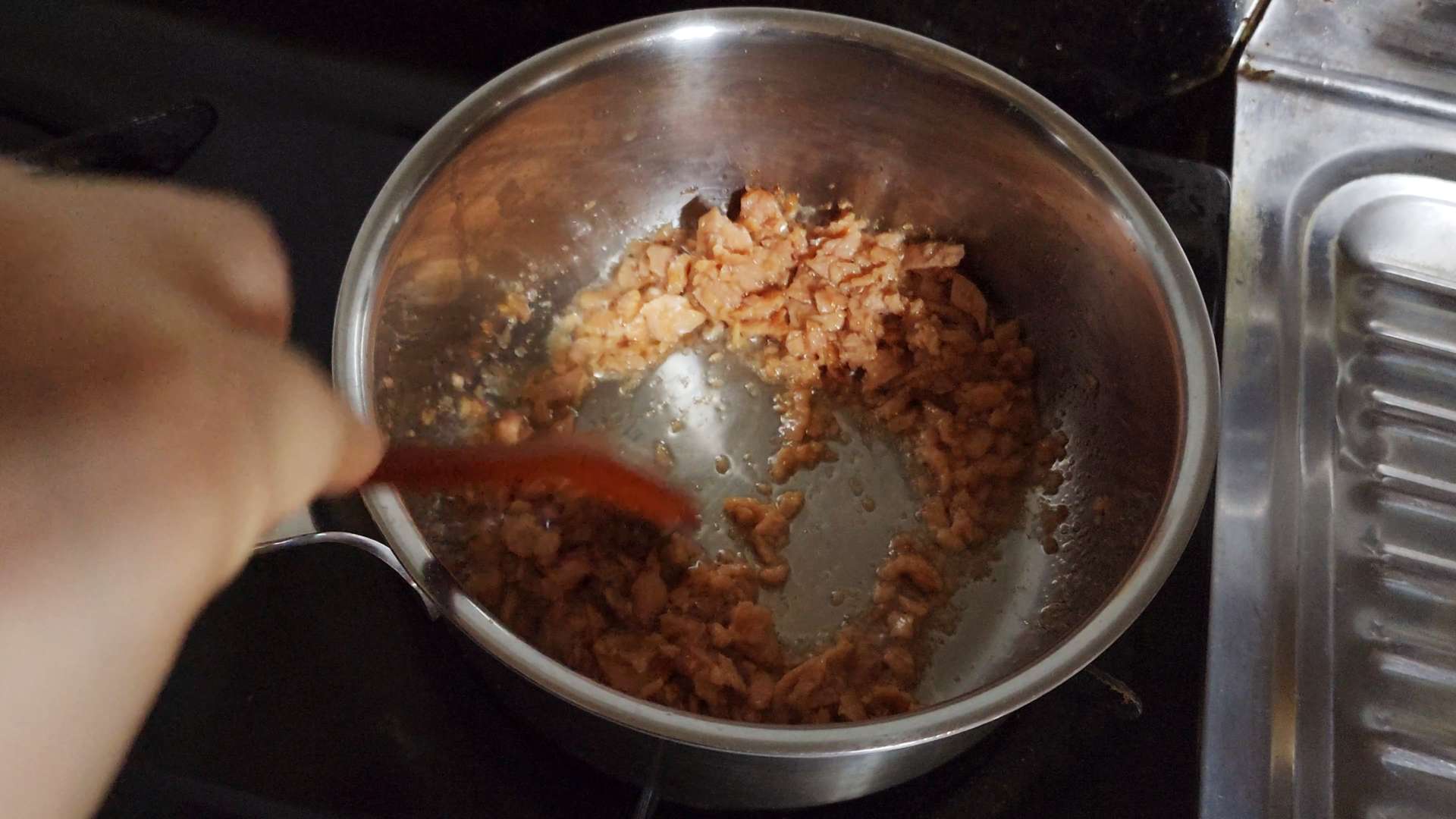 중불로 달군 냄비에 식용유를 넣고 으깬 스팸을 어두운 갈색이 될 때까지 노릇하게 볶아줍니다.