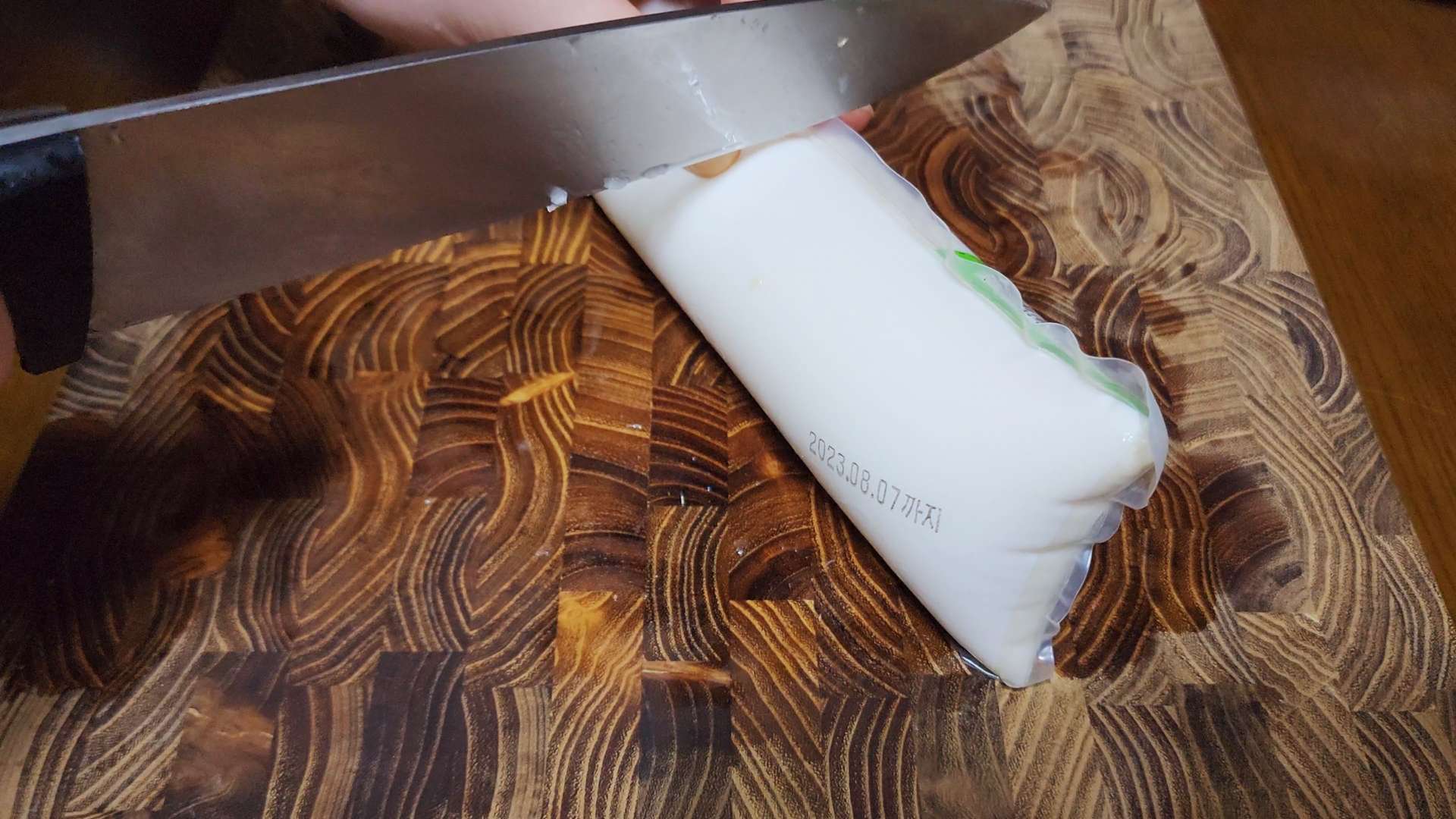 스팸은 흐르는 물에 씻고 반으로 잘라줍니다 .