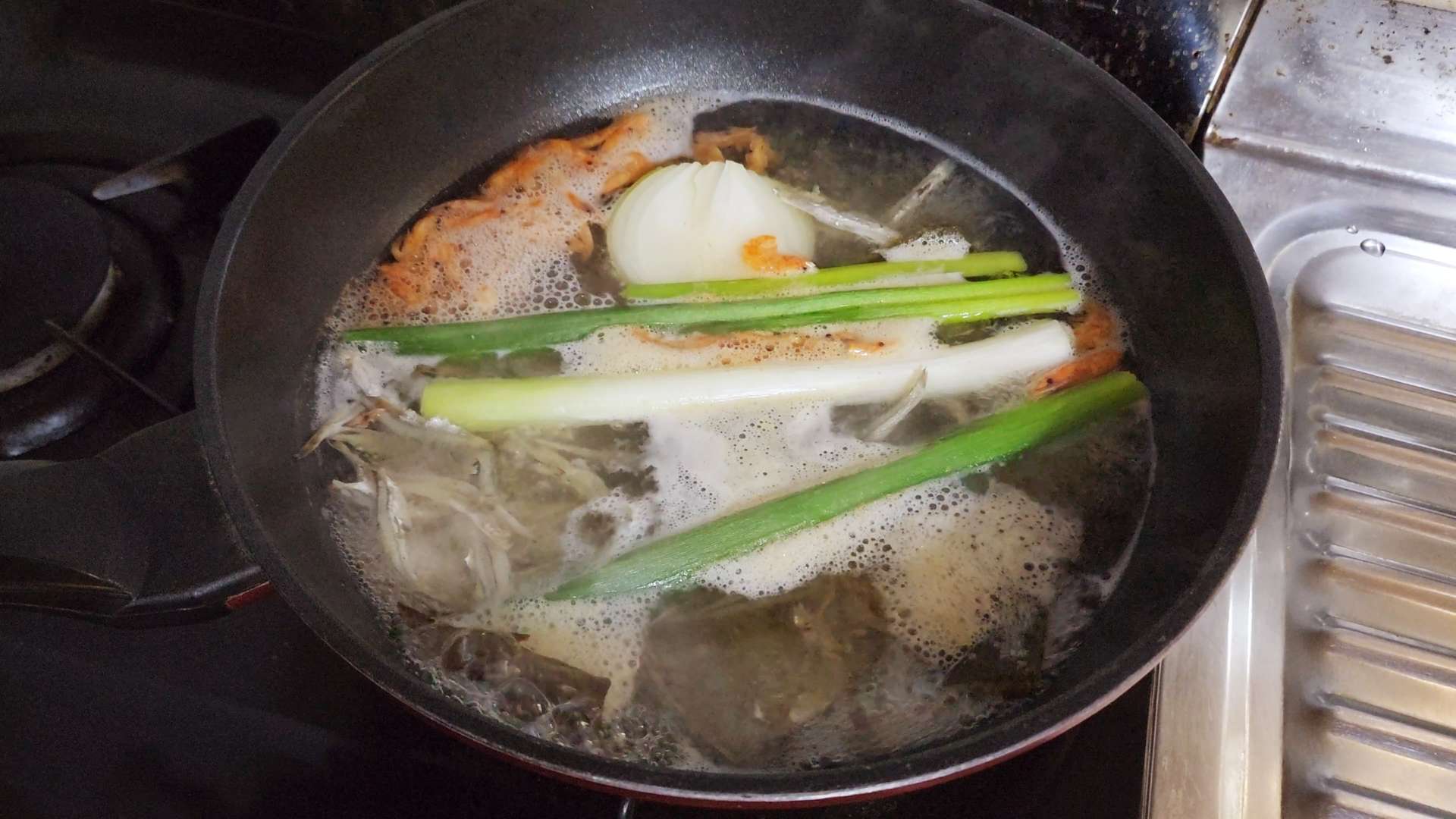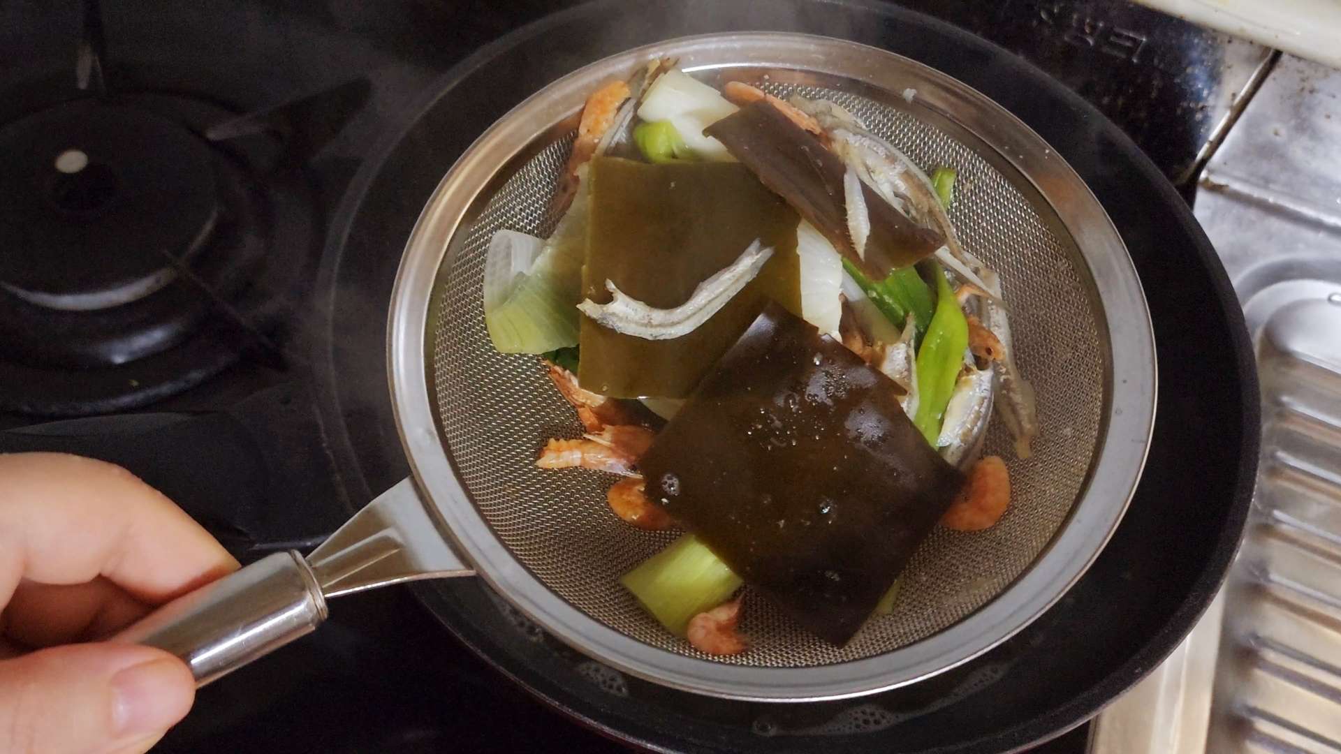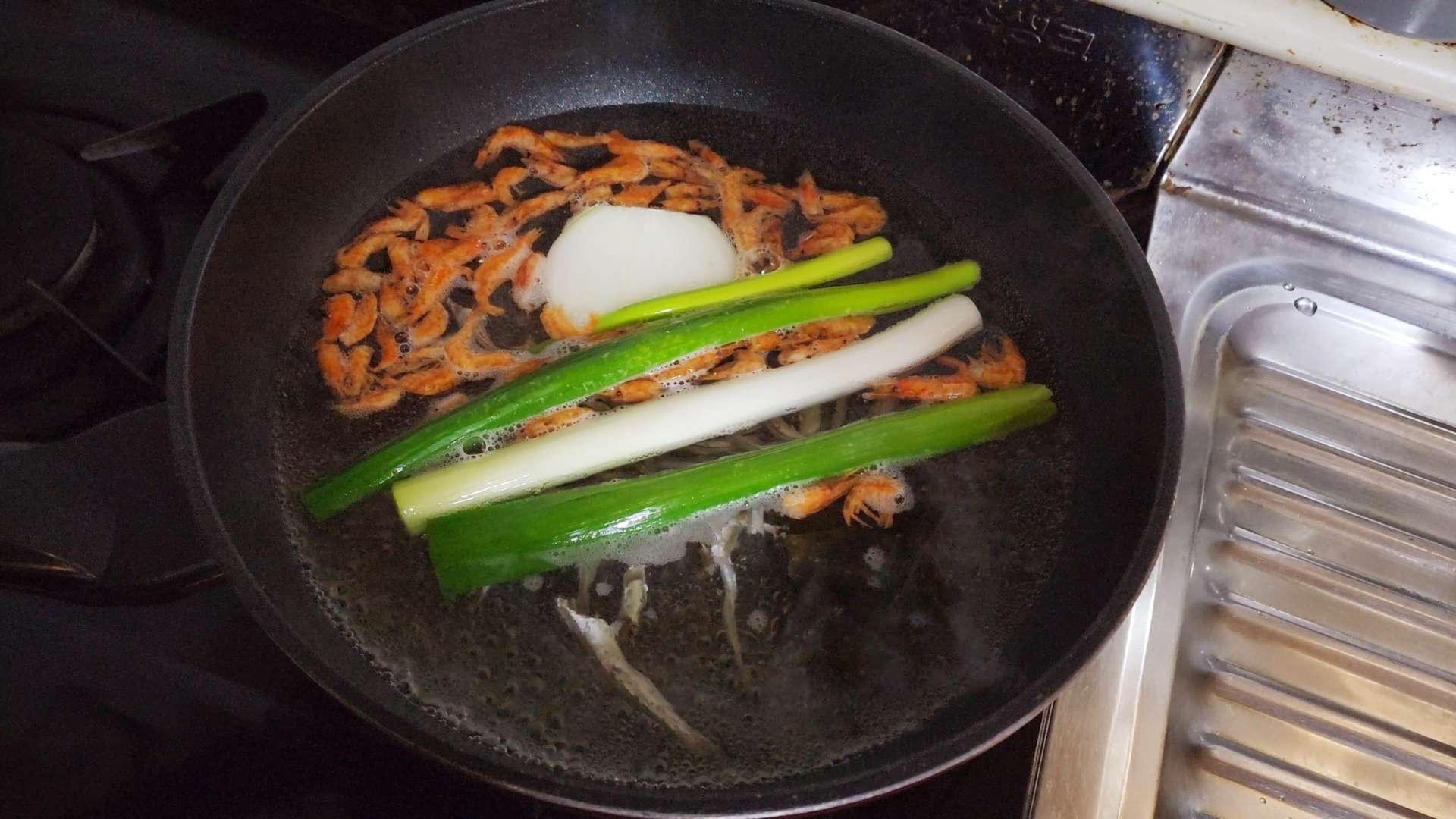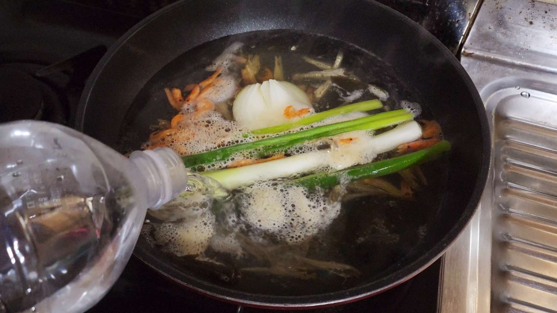 재료: 물 1L, 멸치 한 줌, 건새우 한 줌, 대파 1대,